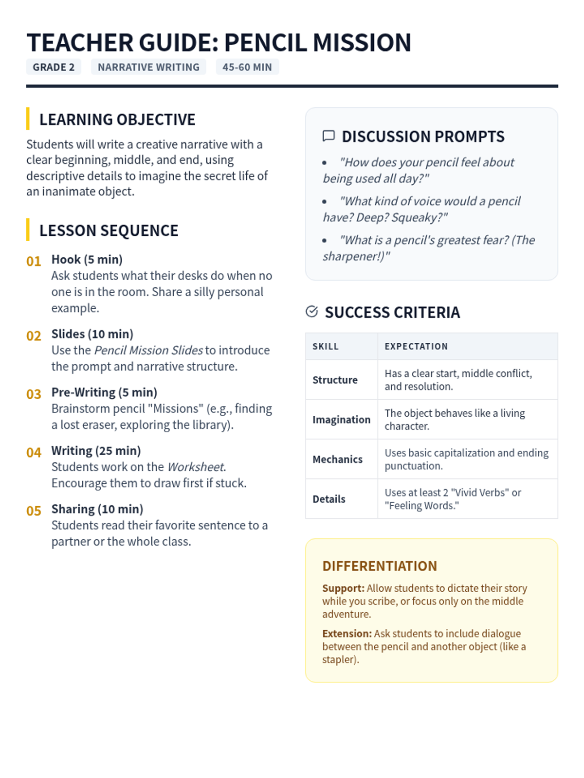 A teacher support document for the Pencil Mission lesson. Includes learning objectives, a timed lesson sequence, discussion prompts, a grading rubric for 2nd grade, and differentiation strategies. Revised to fit on a single page.