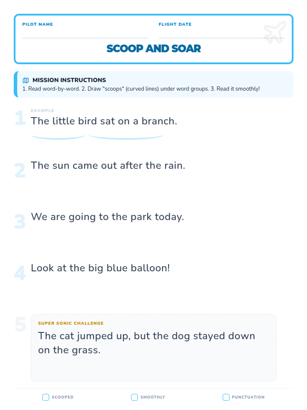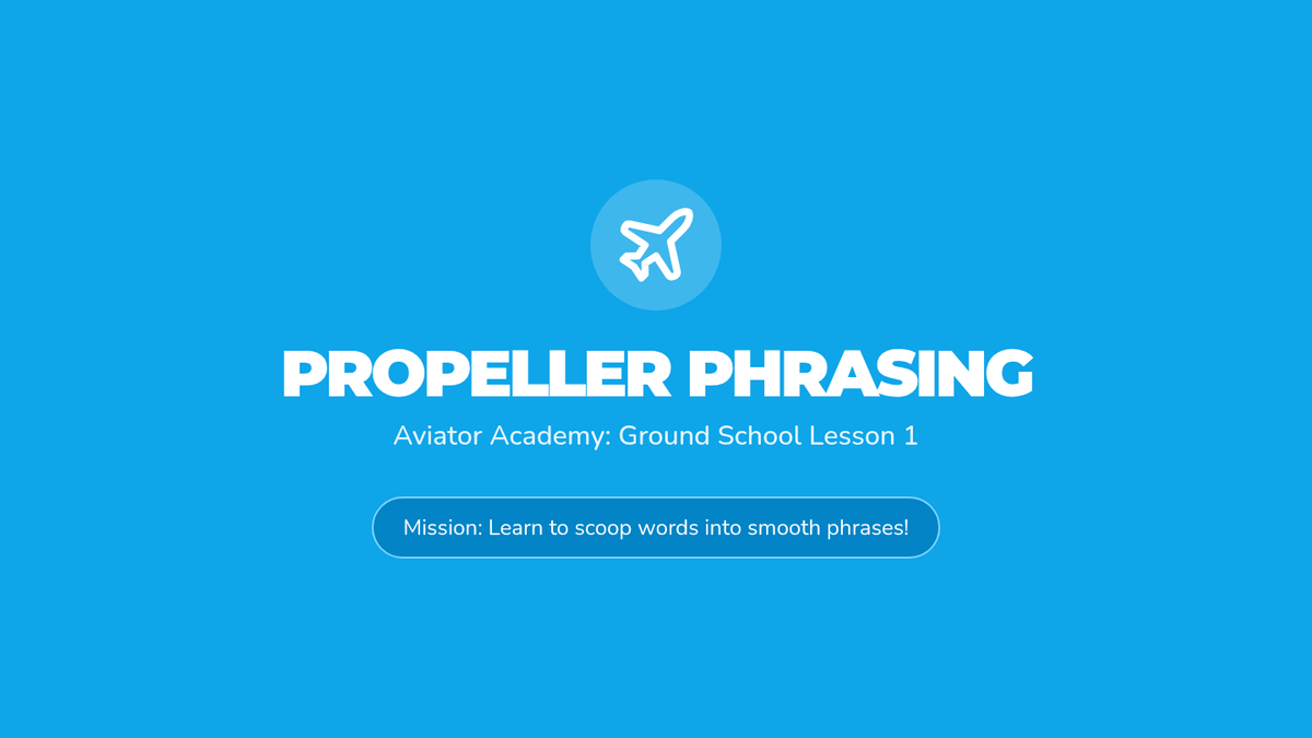 An engaging slide presentation introducing 2nd-grade students to reading fluency through the concept of 'phrasing' and 'scooping' words, using an aviation theme. Revised for better slide balance and instructional clarity.