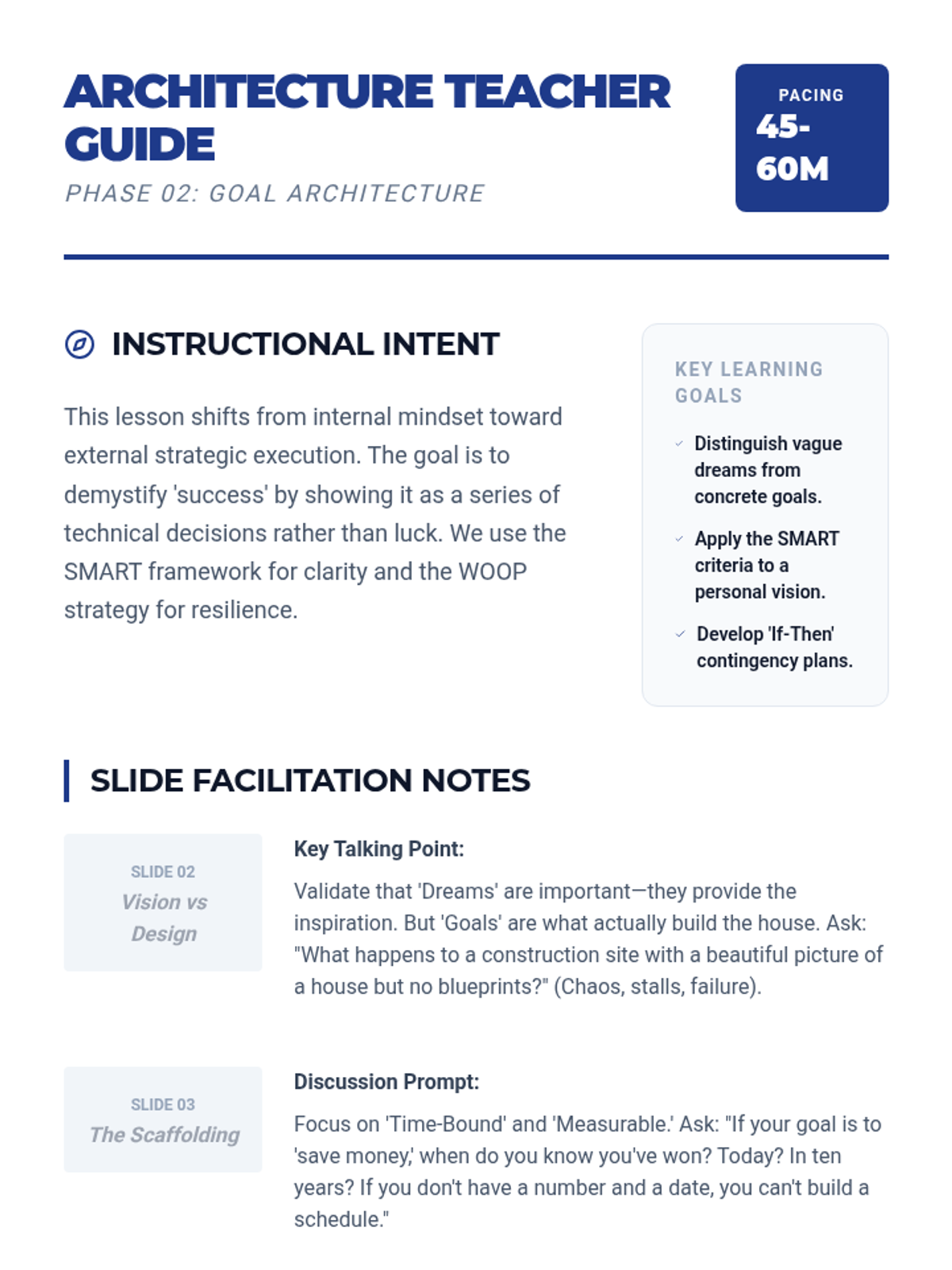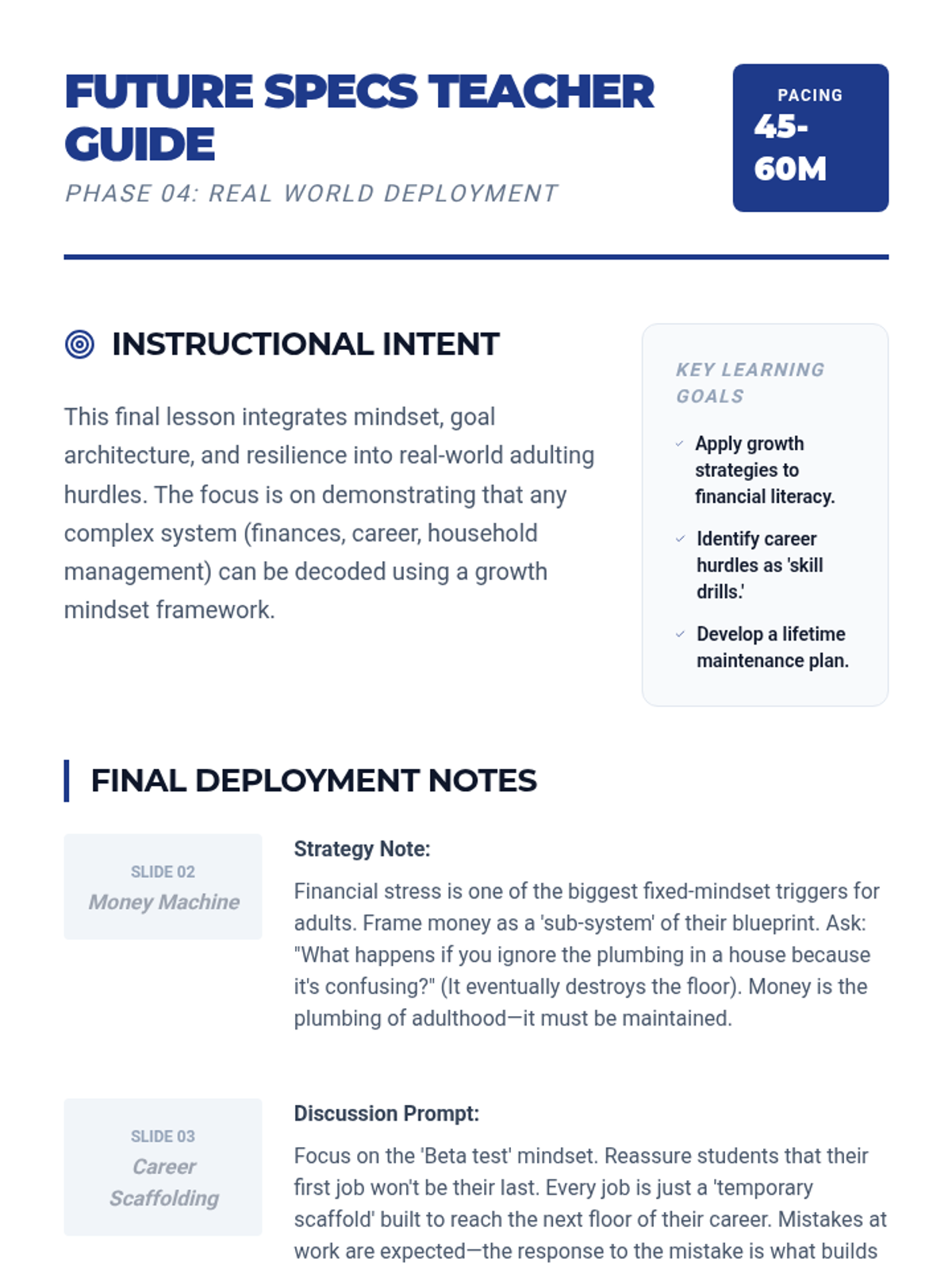 A teacher facilitation guide for Lesson 4, integrating the series into a long-term life blueprint and providing final reflection strategies.