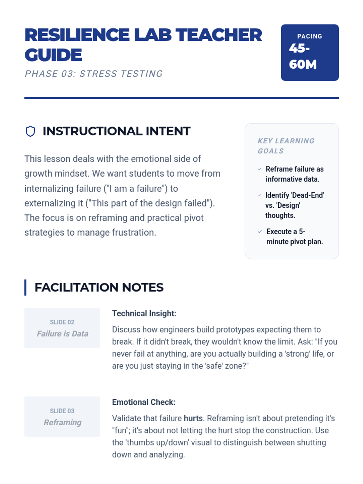 A facilitation guide for Lesson 3, focusing on building resilience and reframing failure with practical pivot strategies.