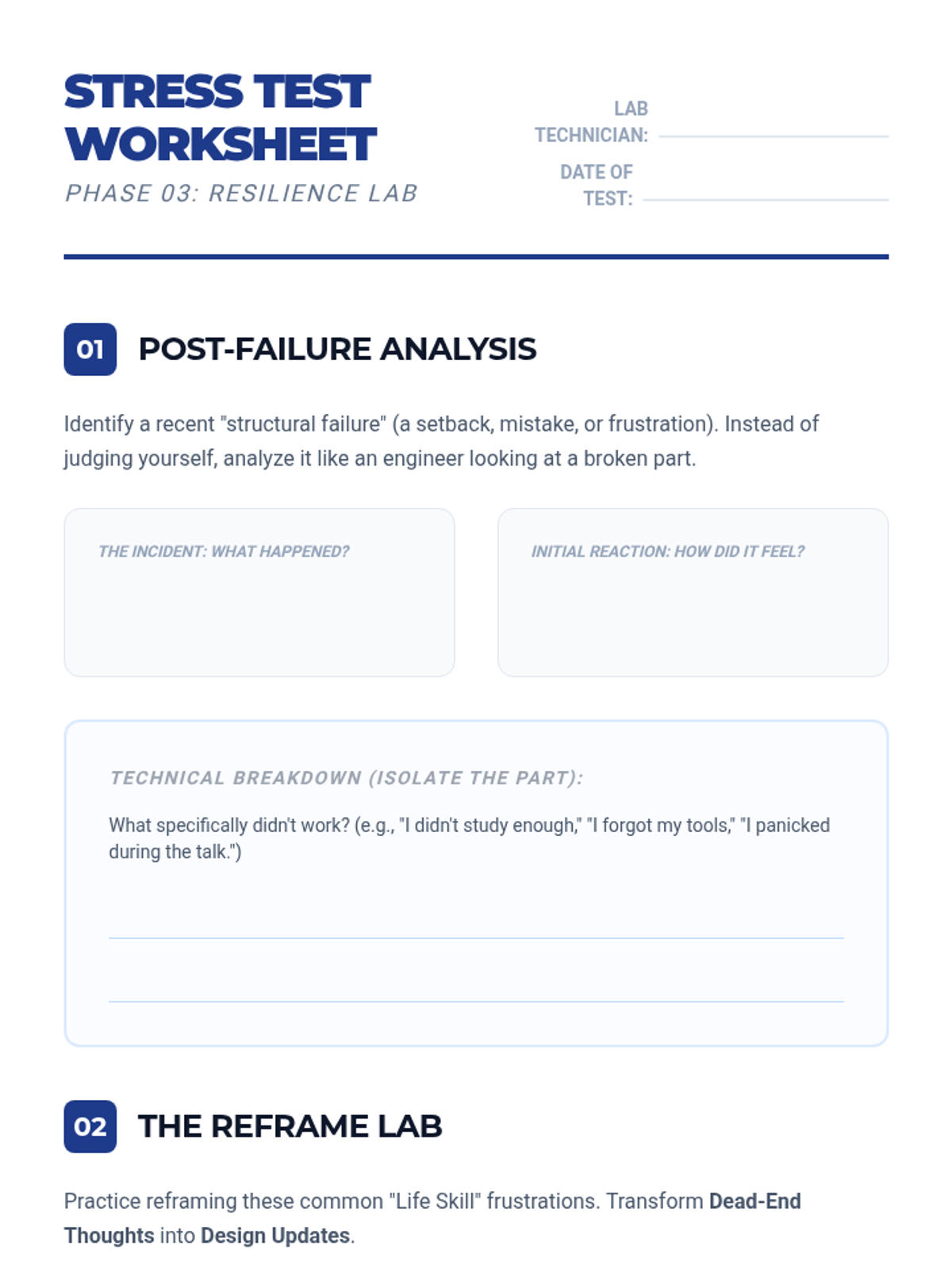 A student worksheet for analyzing setbacks, practicing reframing techniques, and developing a quick 'pivot' plan for frustrations.