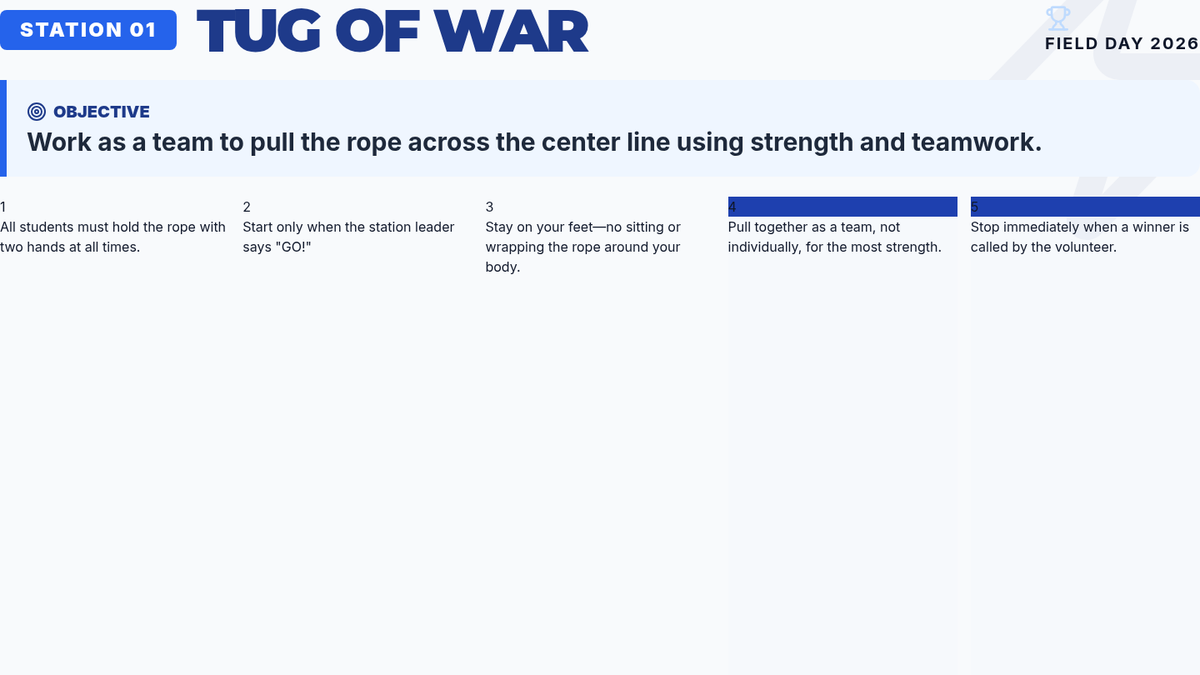 A set of 10 printable station instruction cards formatted as 4.25" x 5.5" postcards (4 per page). Designed for teachers and volunteers, featuring the Arlington Patriots blue and white theme with high-visibility large fonts balanced for readability.