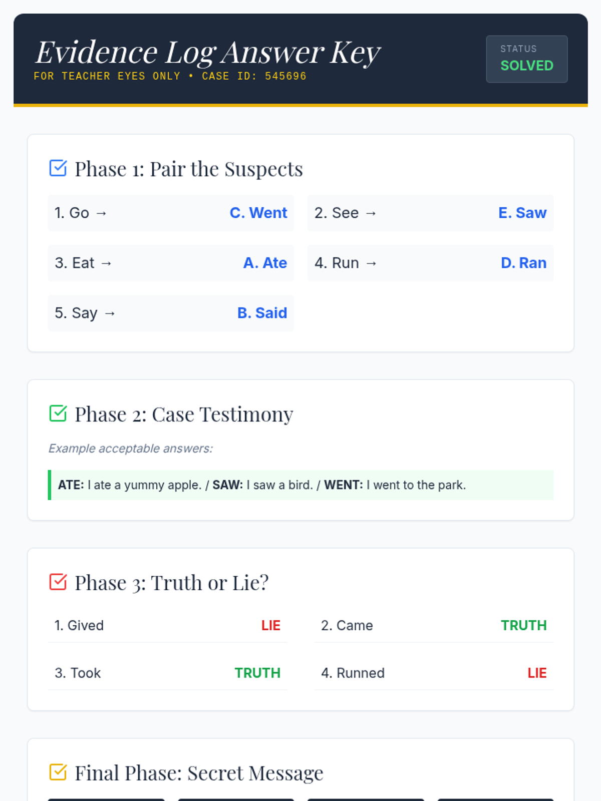 A teacher answer key for the Evidence Log Worksheet, providing clear solutions for matching, sentence writing, and the final secret story completion. Includes instructional tips for teachers.