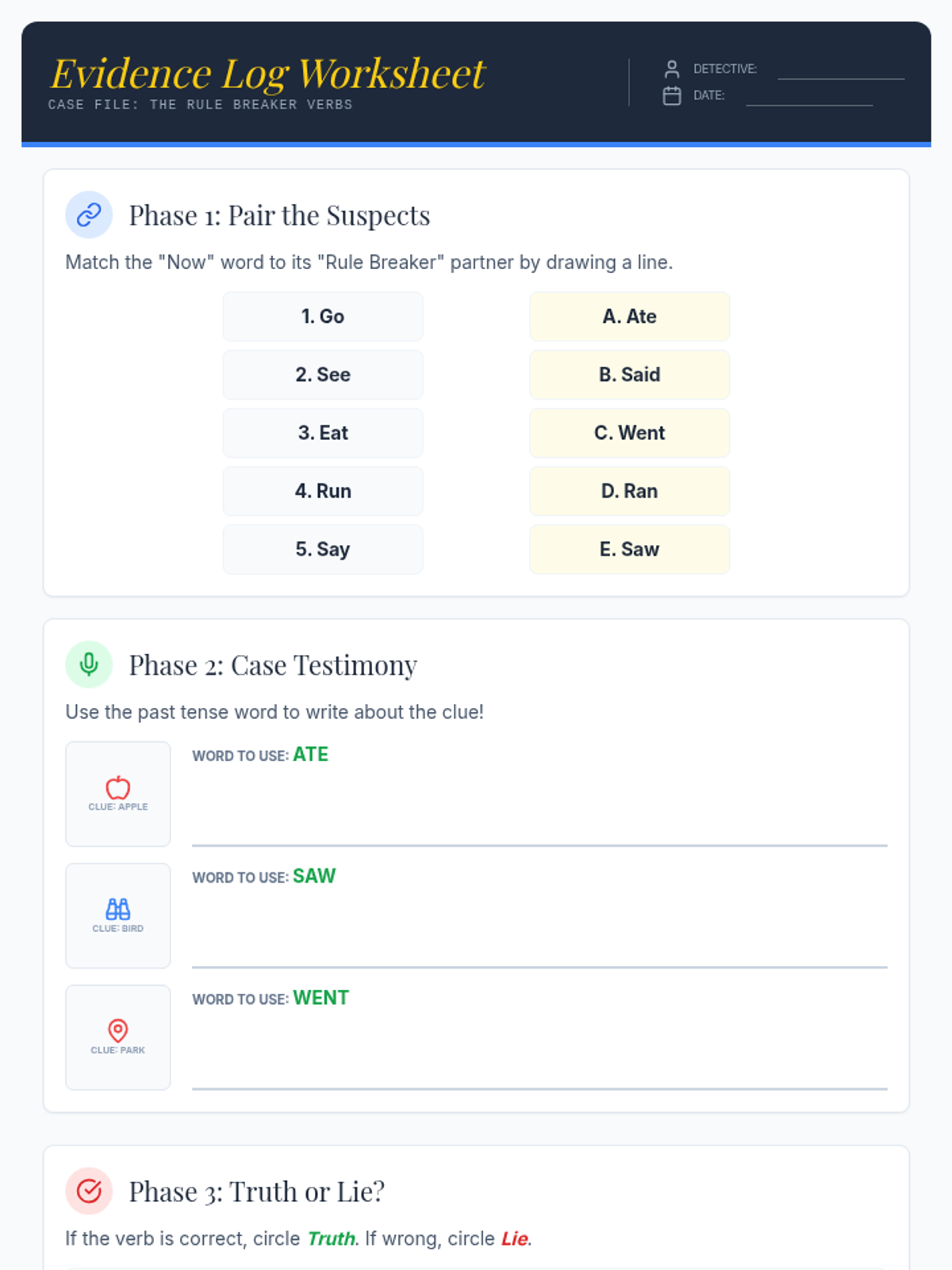 A second-grade friendly detective-themed worksheet for irregular past tense verbs, featuring matching, sentence writing from clues, truth-or-lie identification, and a secret message story completion. Designed as a 2-page print document with ample handwriting space.