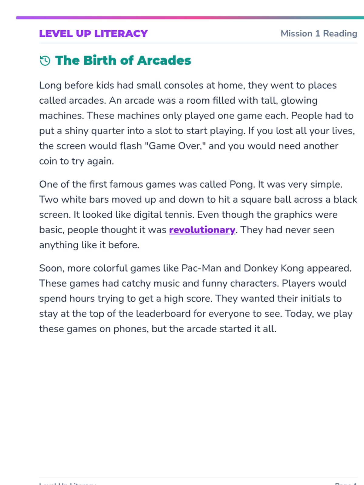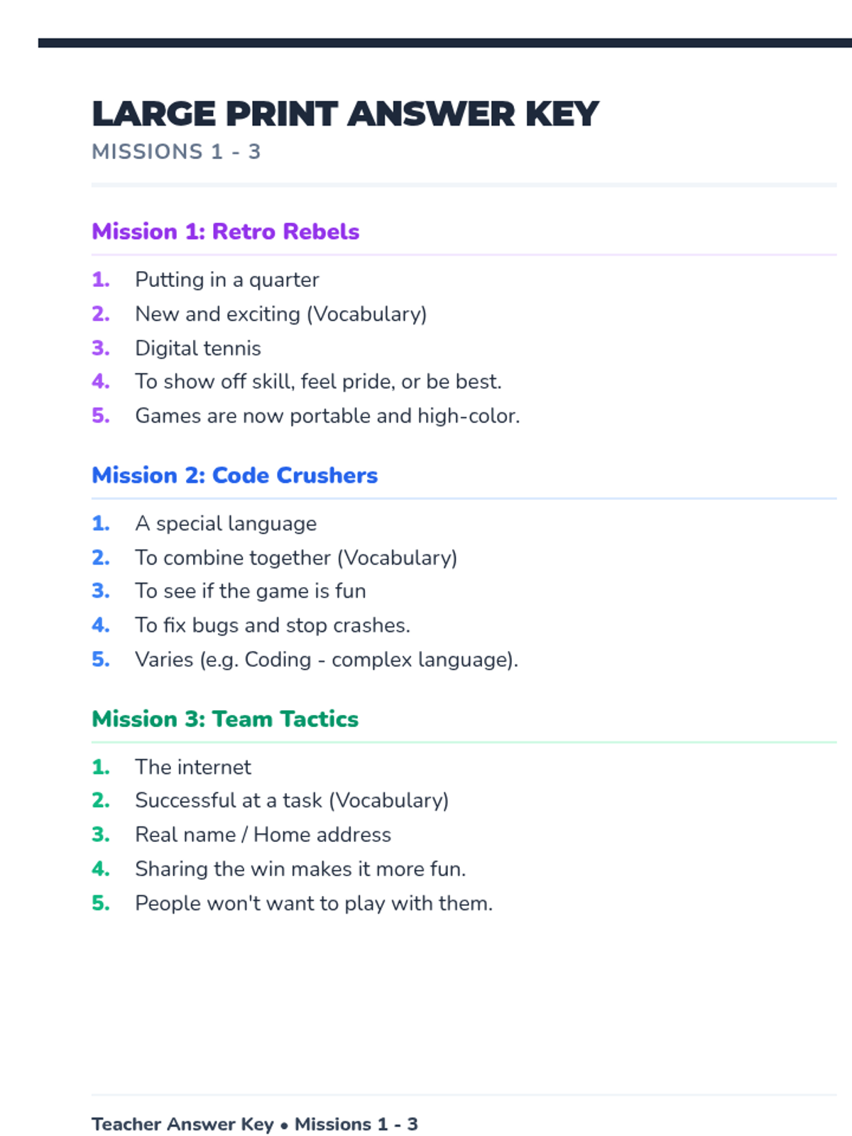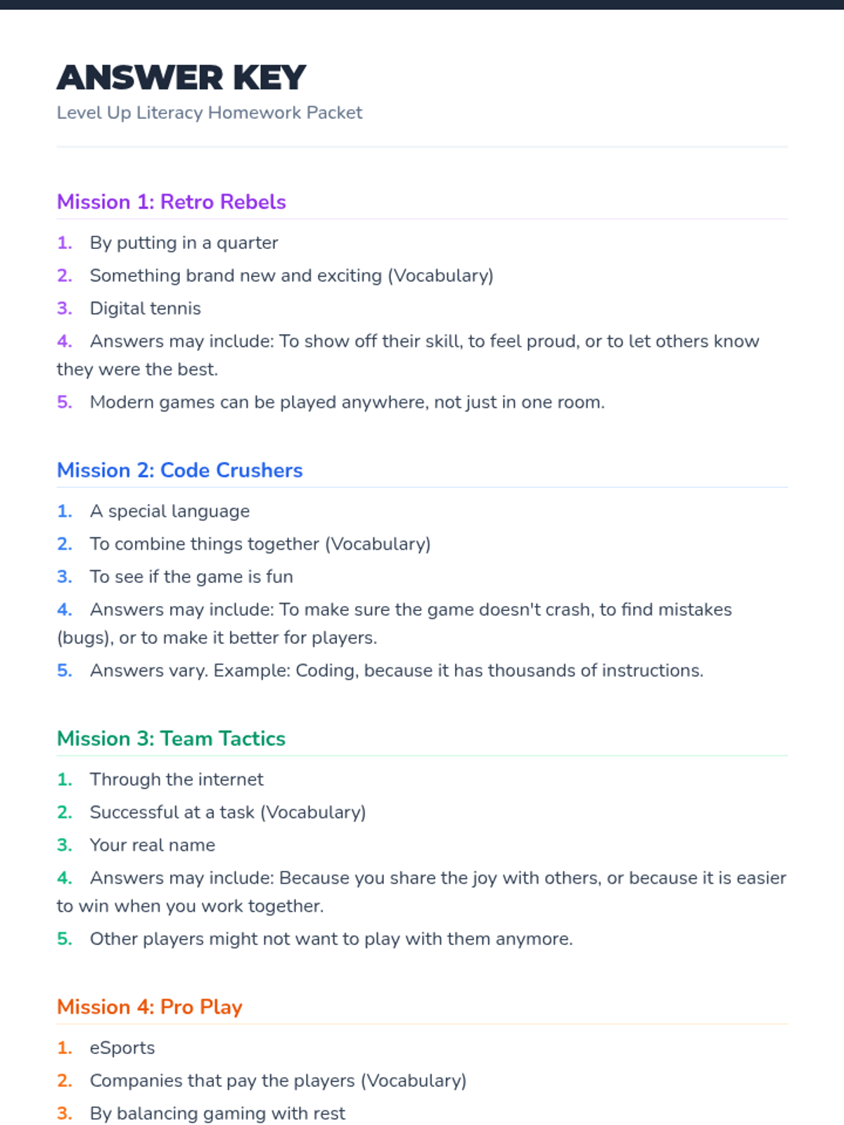 A large-print 2-page answer key for the Level Up Literacy Homework Packet. Features enlarged text (18px+) for better readability for teachers or visually impaired users. Correct responses for all 5 missions are provided.