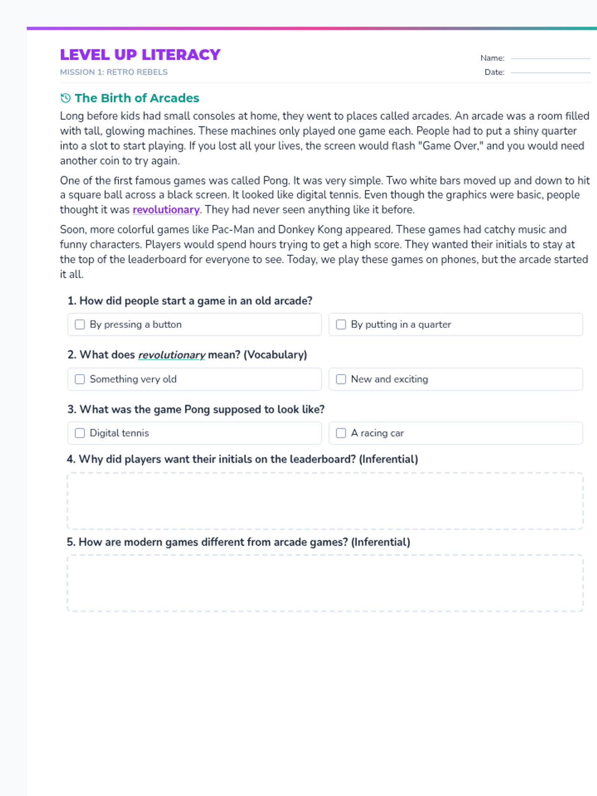 A 5-page homework packet for early 4th-grade students featuring high-interest reading passages about video games. Each page includes a three-paragraph story, three literal multiple-choice questions (including one vocabulary context clue question), and two inferential questions. Each mission is strictly contained to one page.