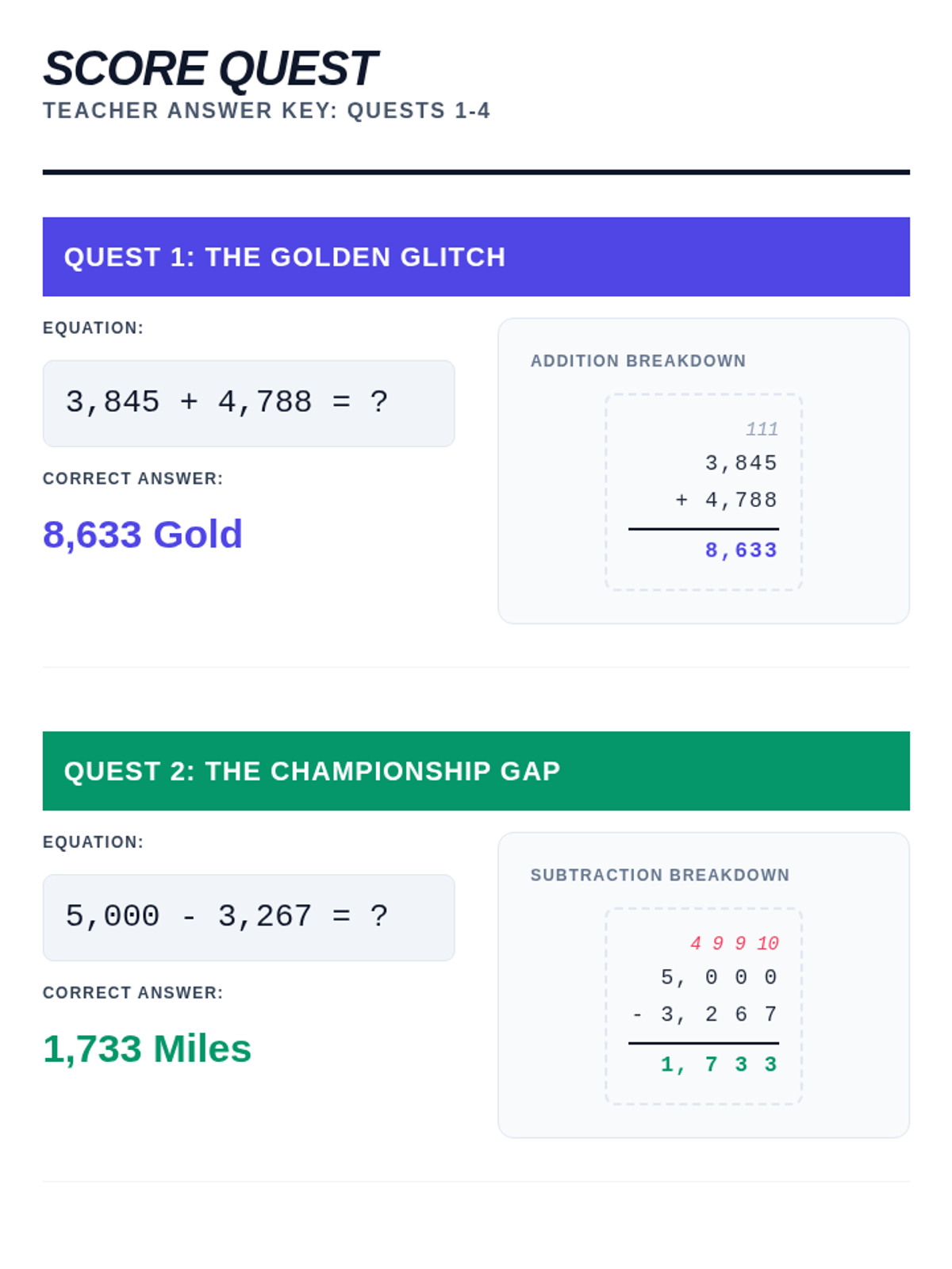 The teacher answer key for the Score Quest Worksheet, featuring detailed step-by-step breakdowns of addition and subtraction regrouping for all four Quests.