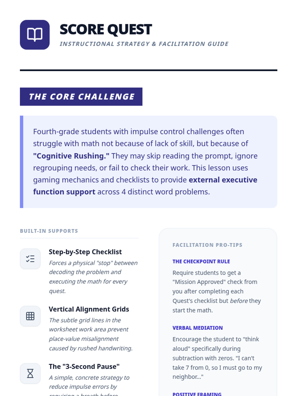 A comprehensive facilitation guide for the Score Quest lesson, offering teacher-facing strategies for managing impulse control, detailed pacing, and differentiation options. Updated to reflect the 4-problem structure.