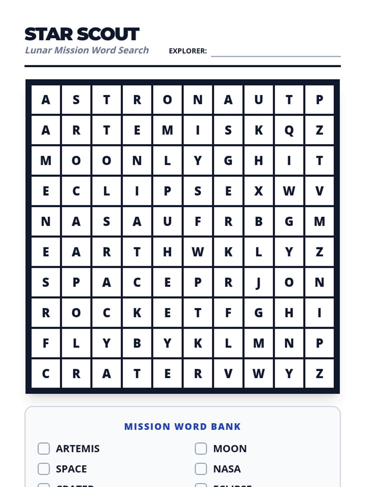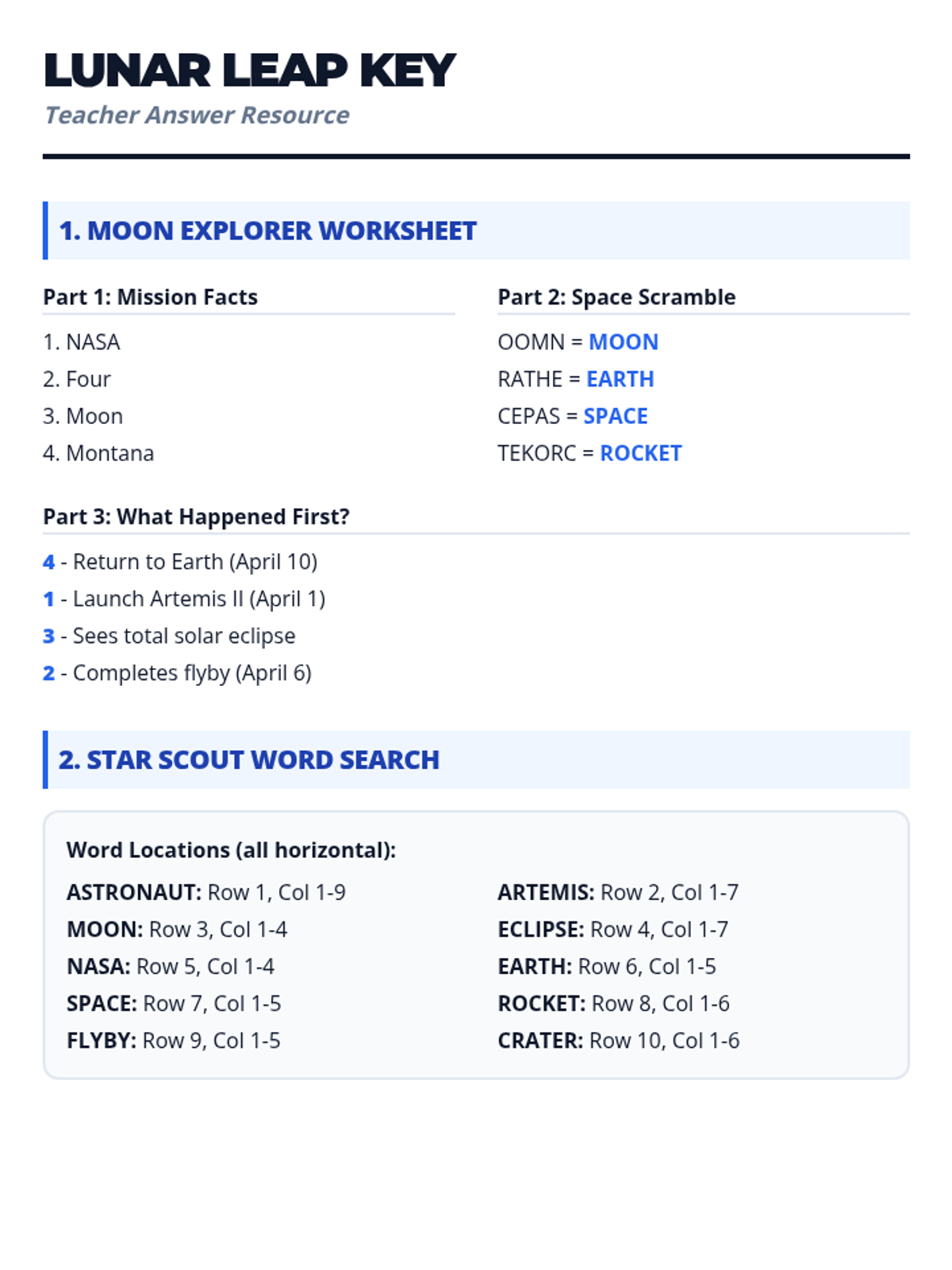 Answer key for the Moon Explorer Worksheet and Star Scout Word Search. Corrected scramble logic and layout.