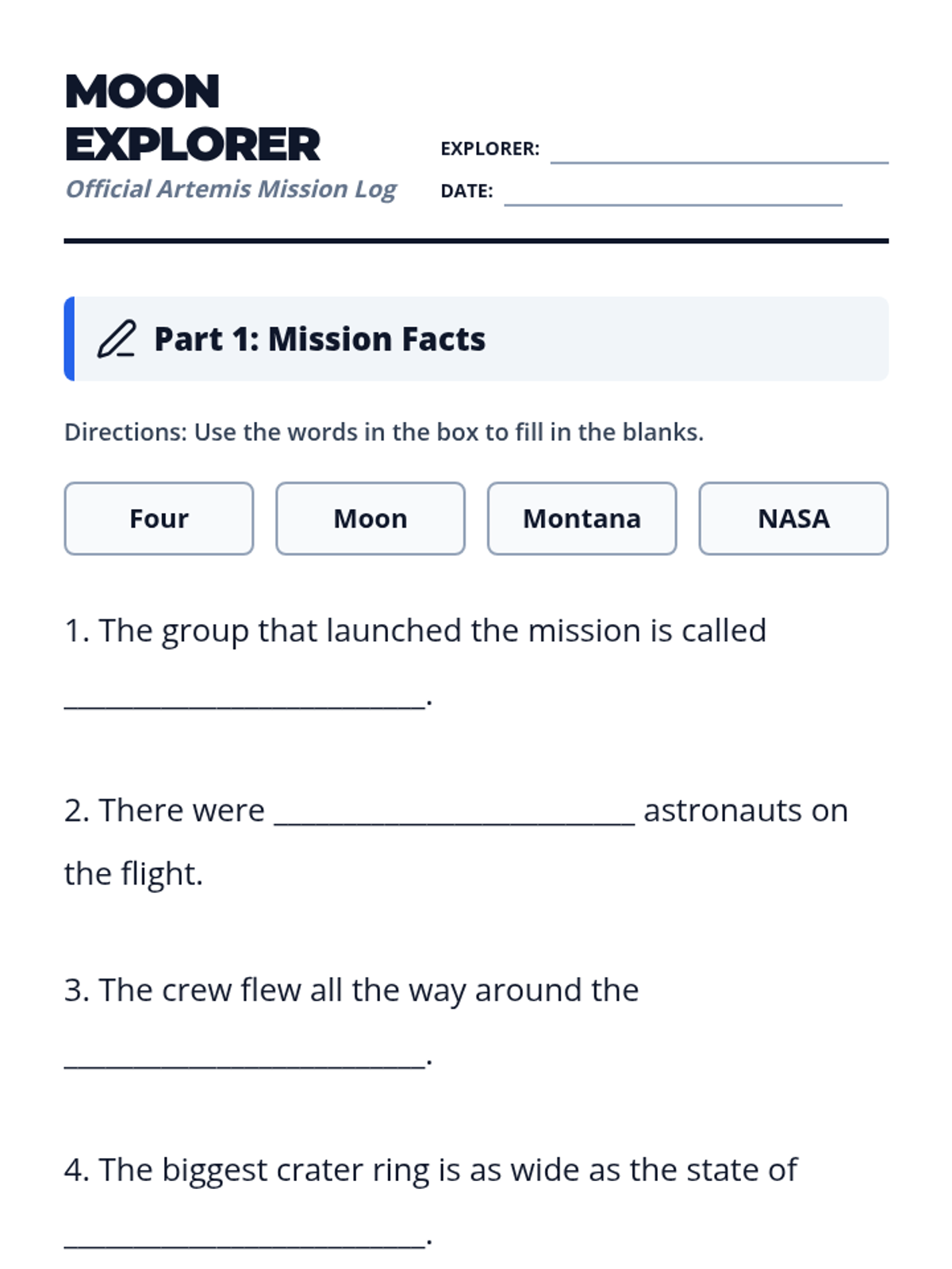 A multi-part worksheet featuring fill-in-the-blank questions, word scrambles, and a sequencing activity based on the Artemis II article.