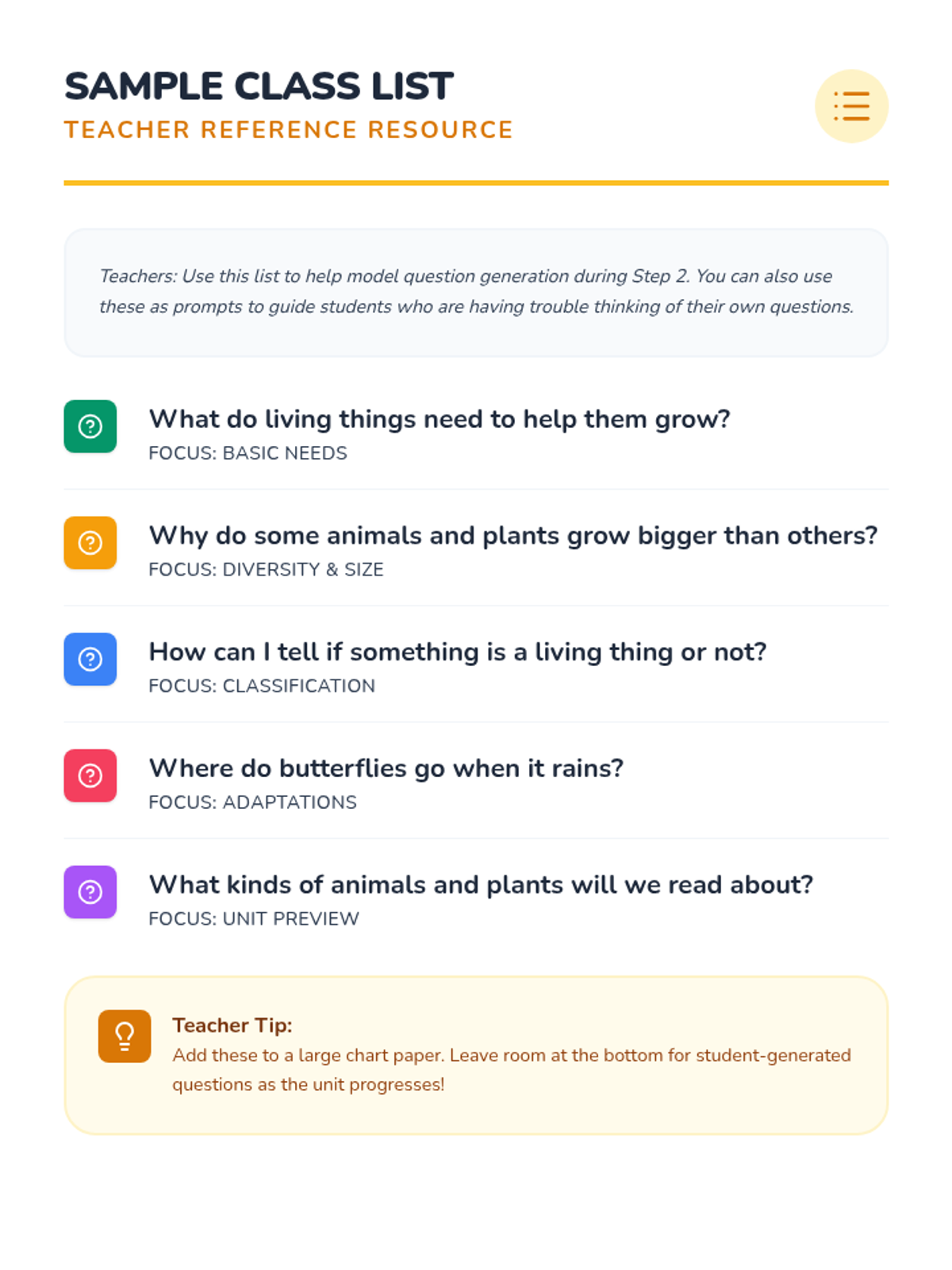 A sample list of curiosity questions for teachers to use when modeling how to ask questions about the natural world. This material serves as a reference for anchor charts and class discussions.