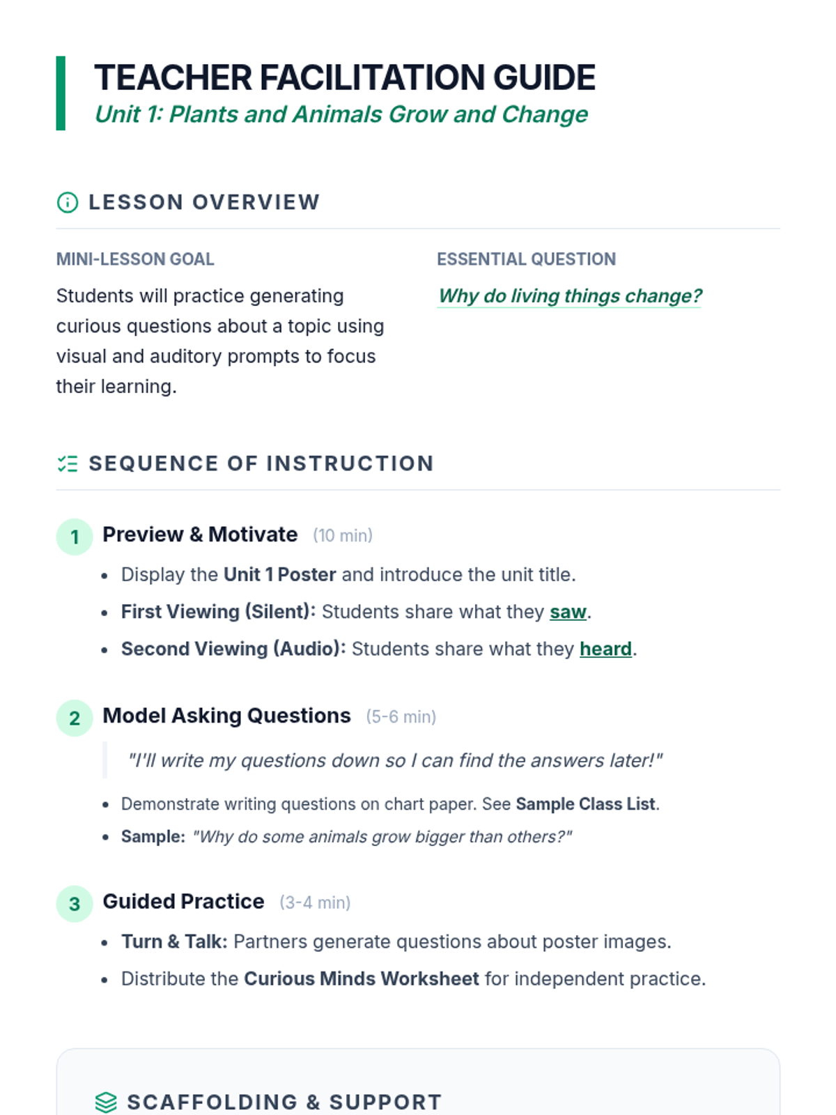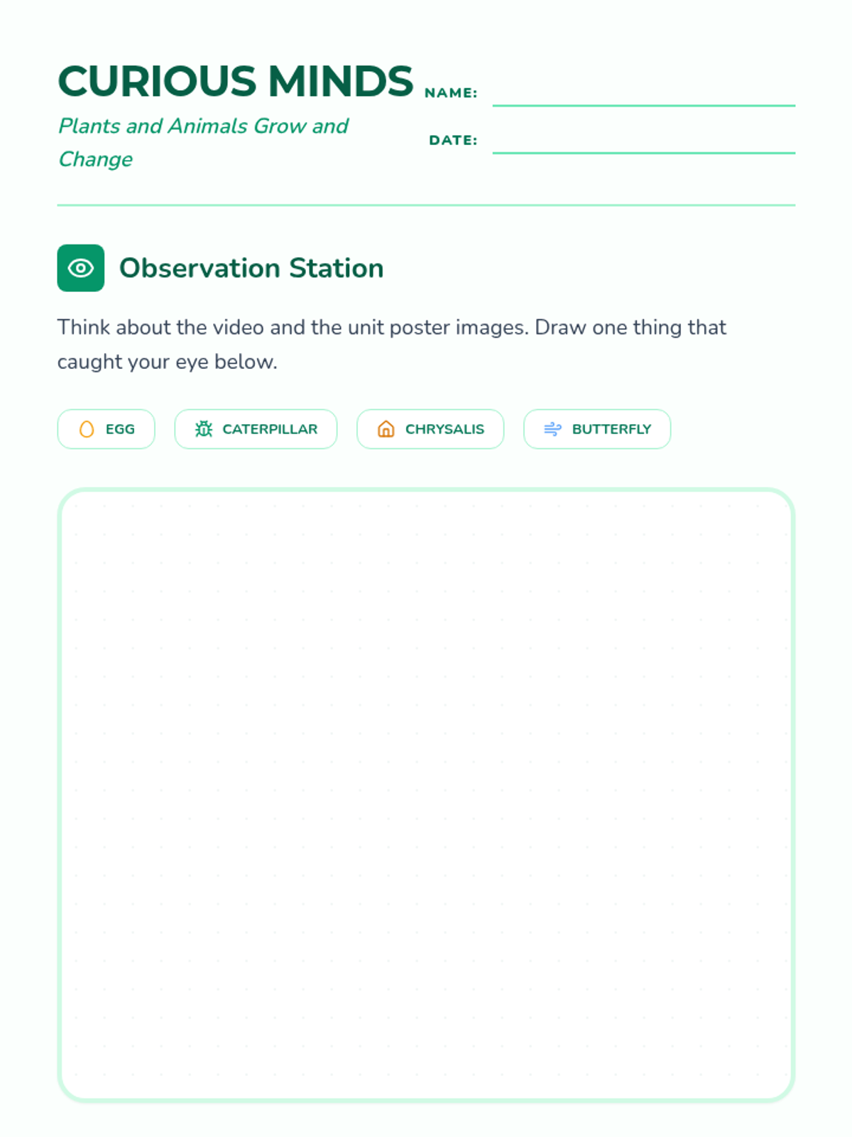 An independent practice worksheet where students record observations from a unit introduction video and generate three of their own curious questions. Revised to fix page break logic and handwriting area sizing.