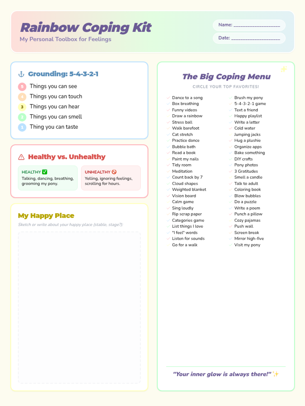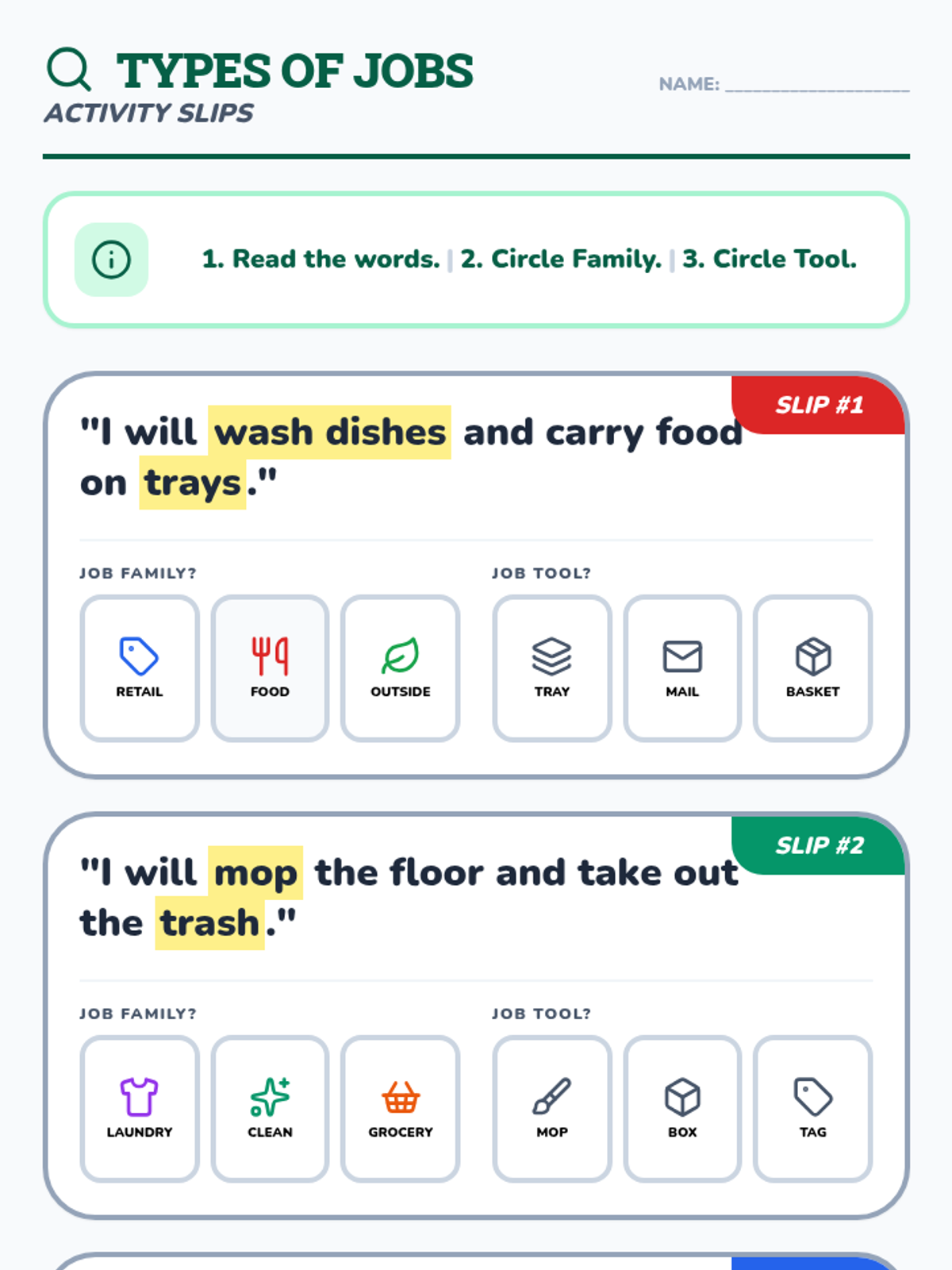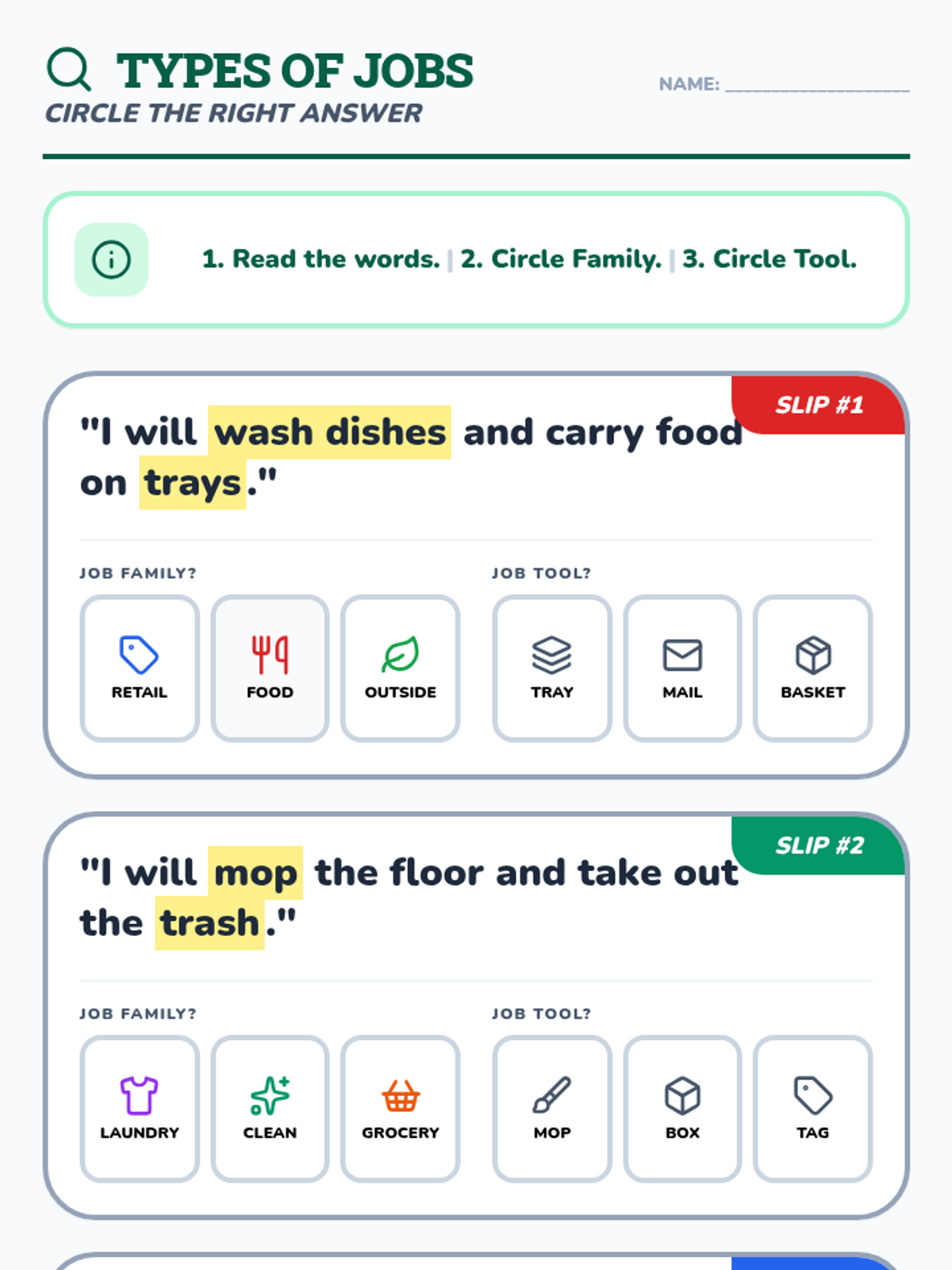 A visual support guide with color-coded categories and clear icons to help students identify which mail items go into the Urgent, HR, Manager, or Trash bins.