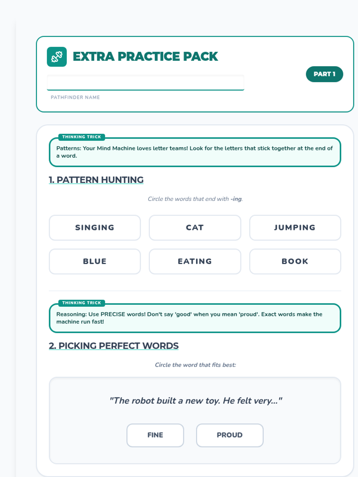 A 3-page extra practice workbook for students aged 6-8. Features pattern spotting, precise vocabulary, logical sentence building, character empathy, and growth mindset exercises with simplified strategy clues.