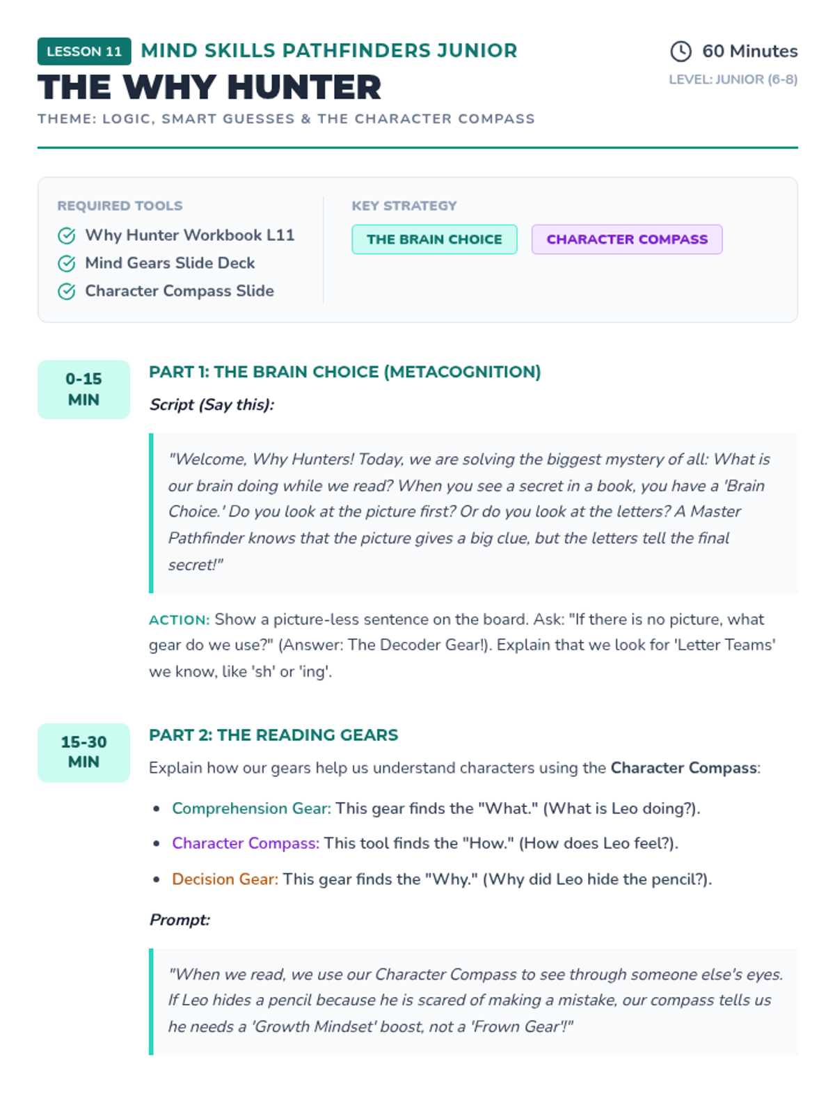 A detailed facilitator script for Lesson 11: Decision Detective Agency (The Why Hunter), focusing on logic, decision-making, and smart guessing (inference) for children aged 6-8. Revised to include Character Compass and academic gear links.