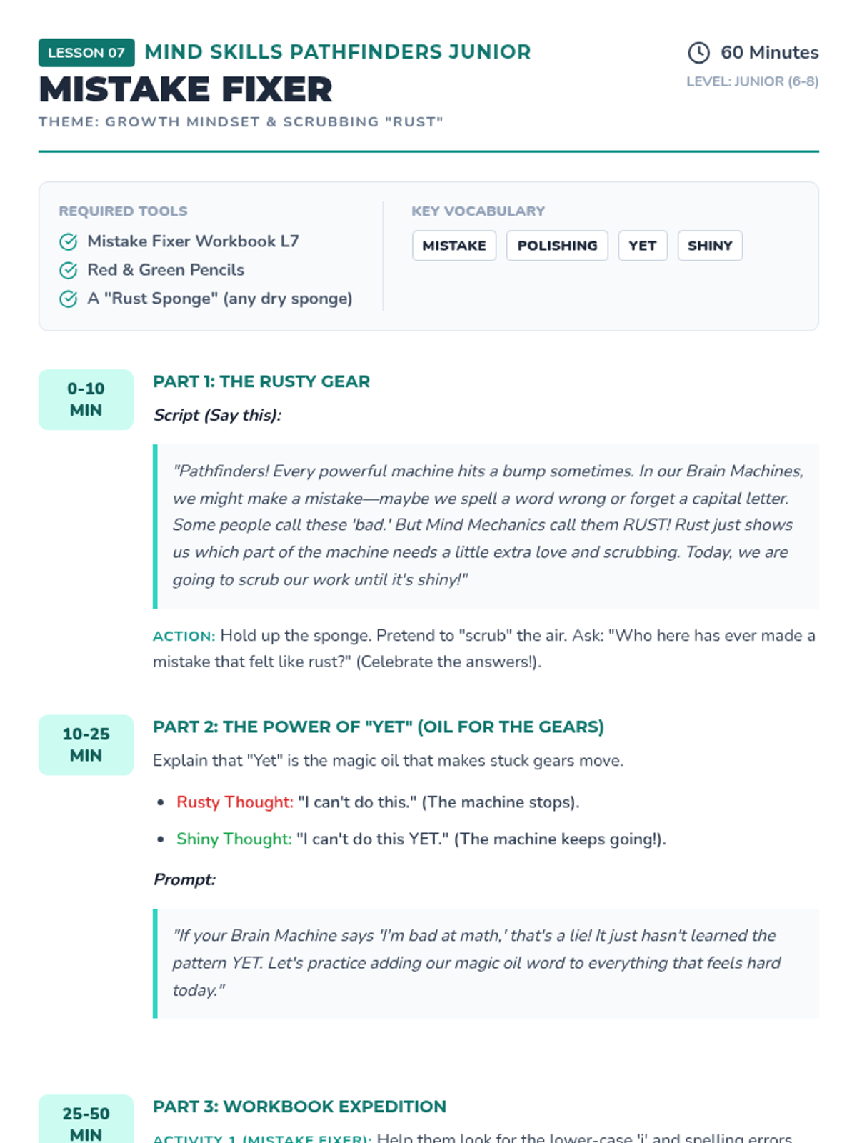 A detailed facilitator script for Lesson 7: Resilience Gear Grind (Mistake Fixer), focusing on growth mindset, editing skills, and the 'Power of Yet' for children aged 6-8.