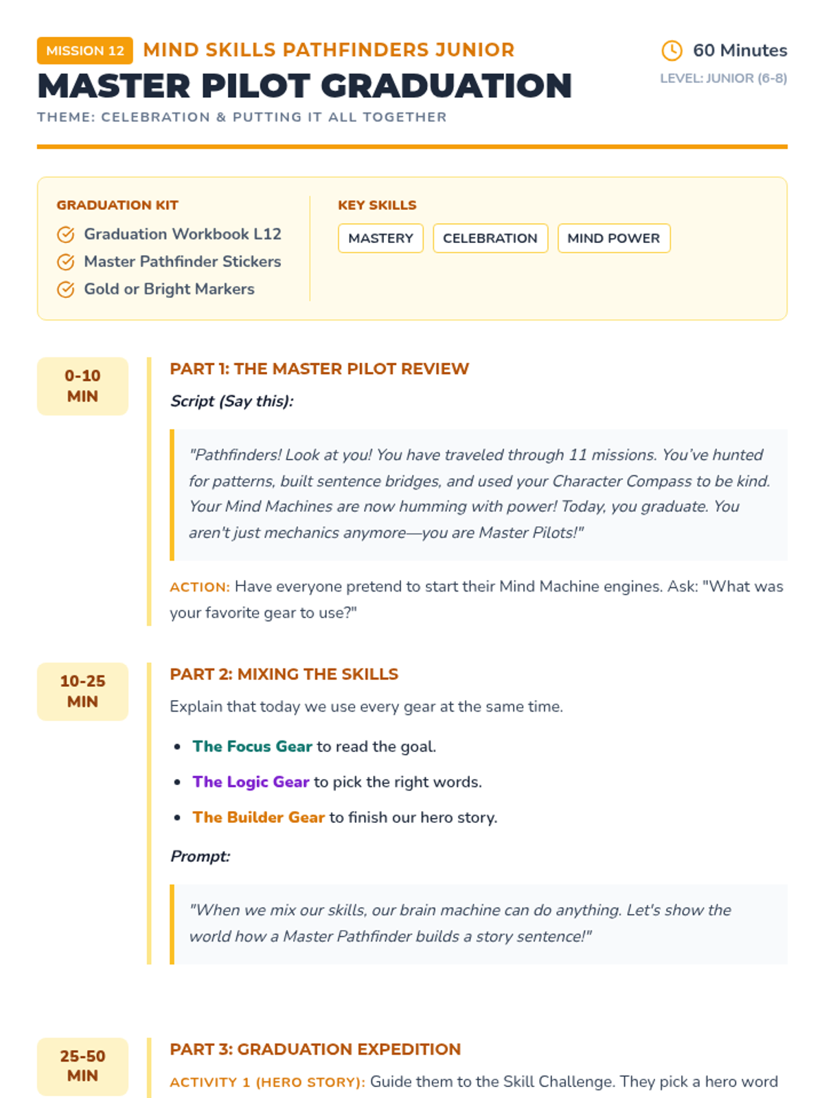 A detailed facilitator script for Lesson 12: Master Pathfinder Graduation, using simple language to explain synthesis and mastery as "mixing all your gears." Revised to fix page breaks and style consistency.