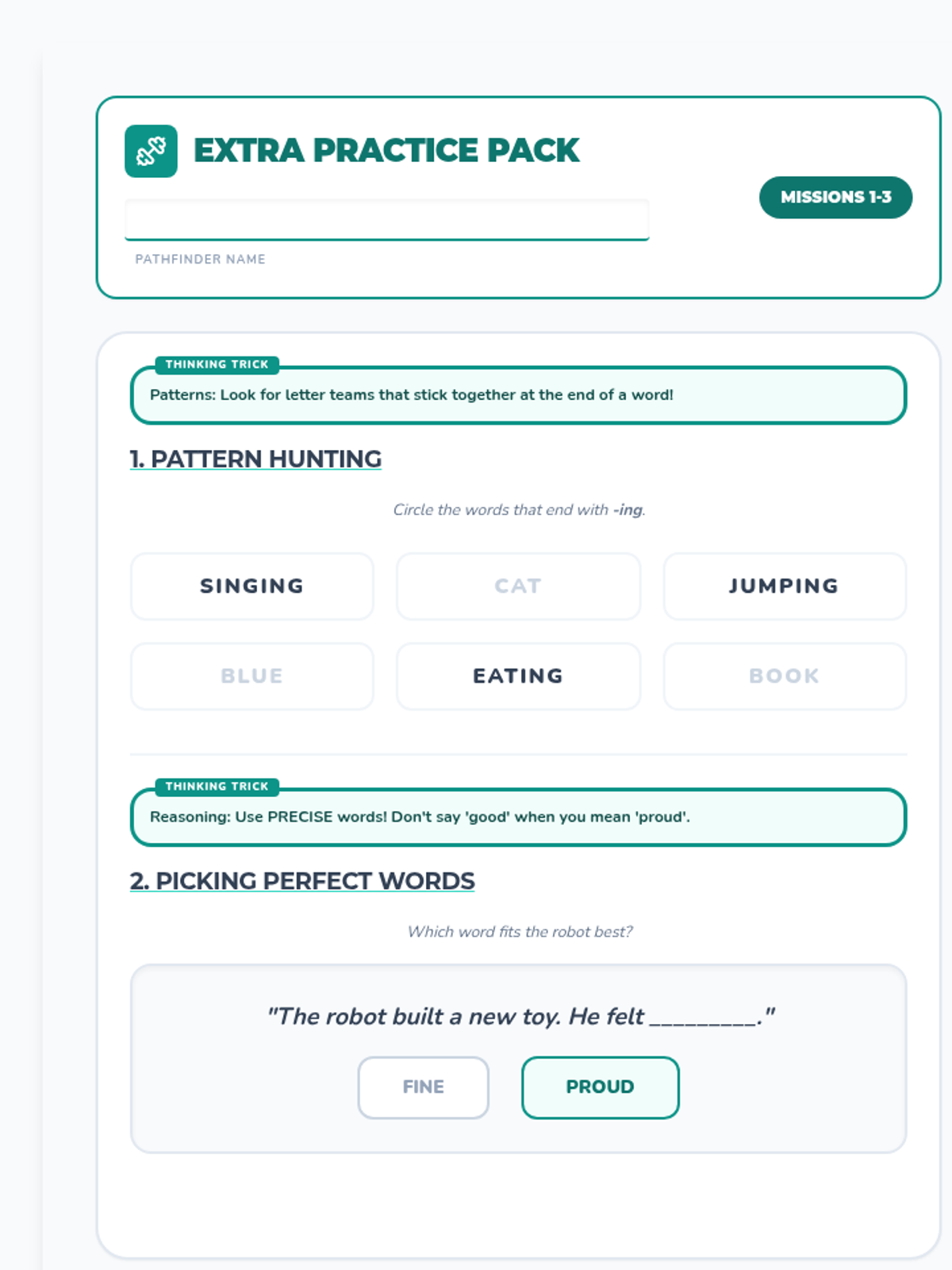 A 3-page extra practice workbook for students aged 6-8. Features pattern spotting, precise vocabulary, logical sentence building, character empathy, and growth mindset exercises with simplified strategy clues. Revised to ensure answer choice uniformity and improved readability.