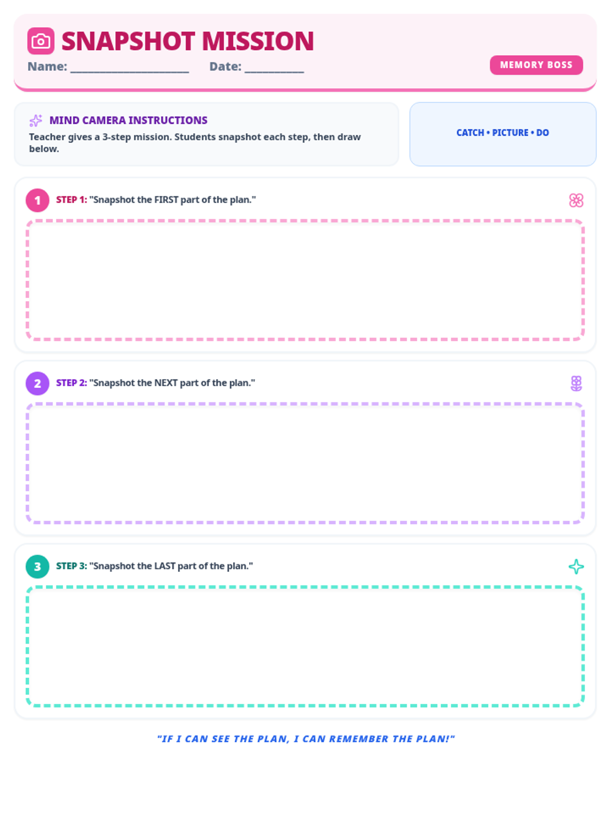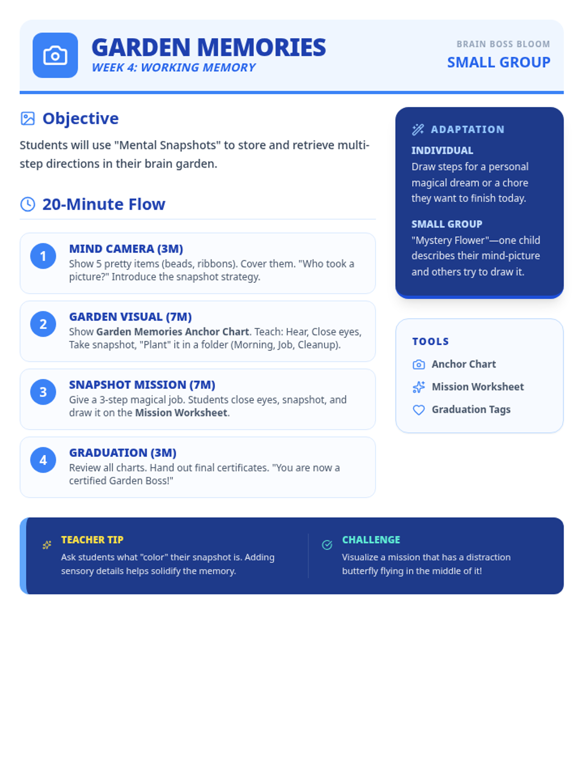 A 20-minute teacher guide for Week 4 of 'Brain Boss Bloom', focusing on visualization strategies and graduation from the 4-week EF unit.