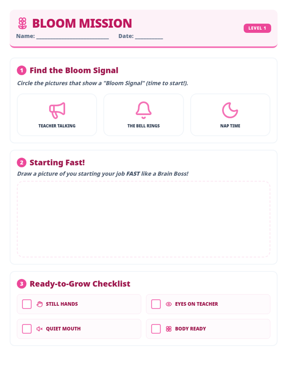 A girl-friendly mission worksheet for Week 1, featuring pink and floral accents, white drawing areas, and clear checklist icons.
