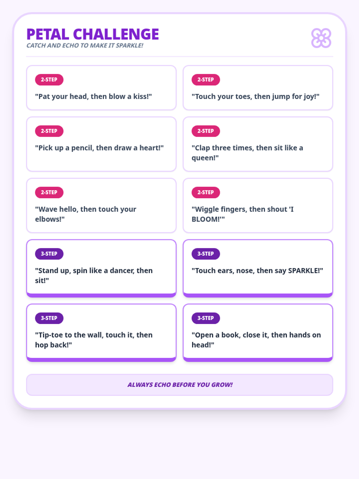 Final revised card set with reordered difficulty levels, standardized borders, higher contrast tags, and fixed page flow.