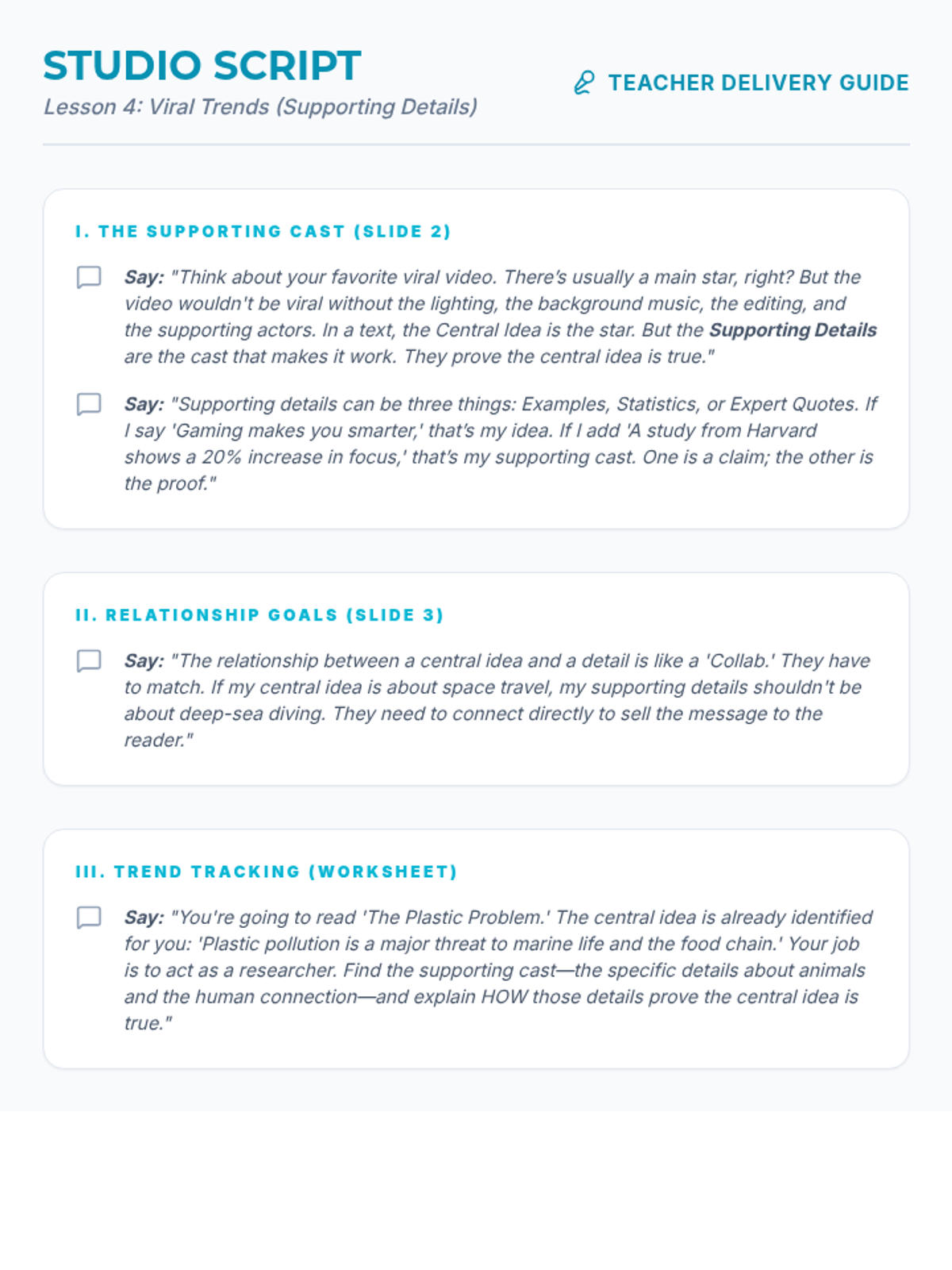 Teacher instructional script for Lesson 4, teaching the relationship between central ideas and supporting details using the 'supporting cast' analogy.