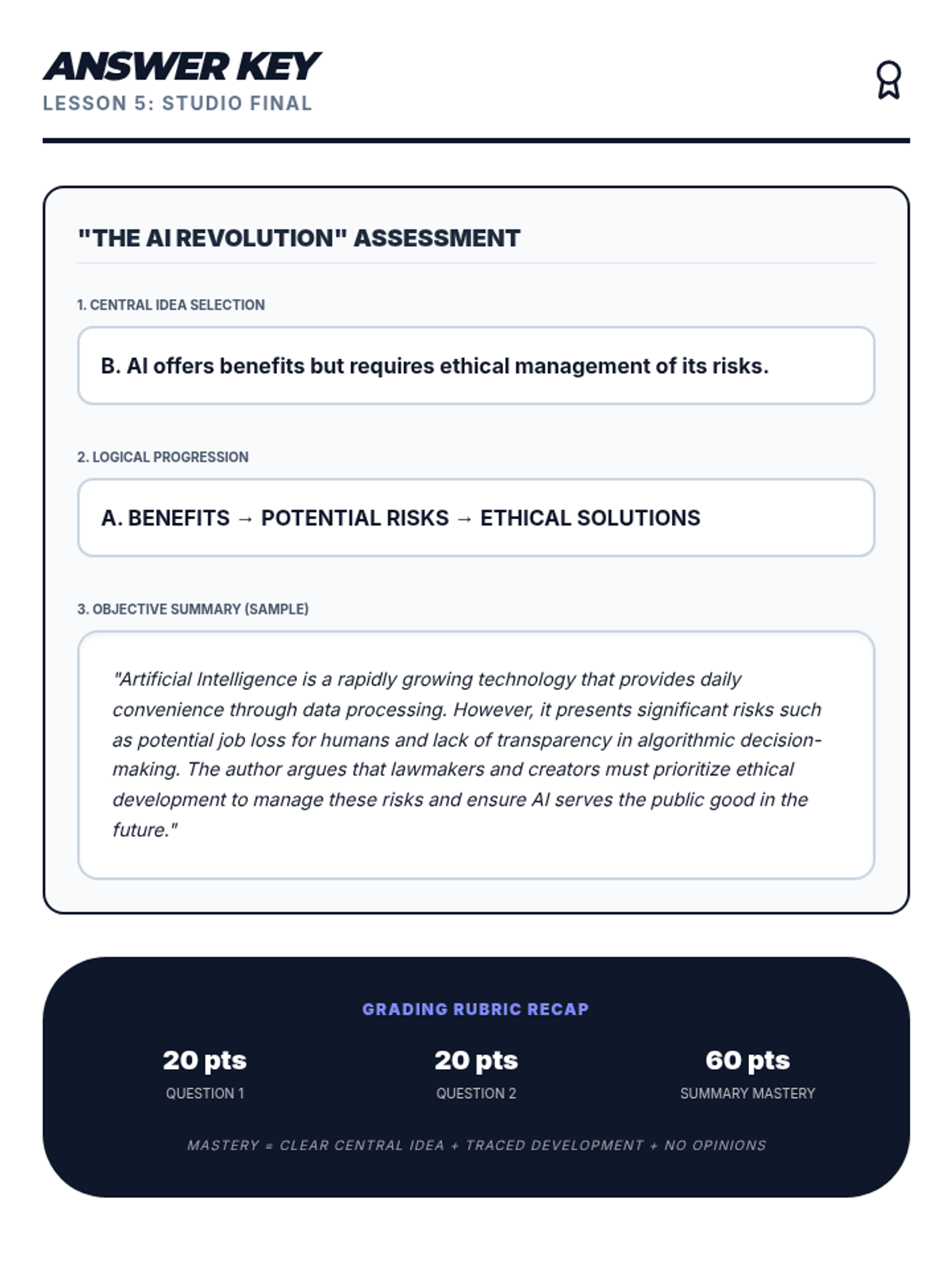 Final answer key for the Lesson 5 Studio Assessment, providing correct answers for the multiple-choice questions and a model objective summary.