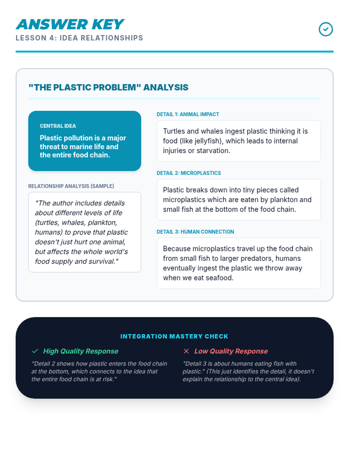Answer key for the Lesson 4 'Idea Relationship Organizer', providing specific detail analysis for all 3 details and guidance on connecting details to central ideas.