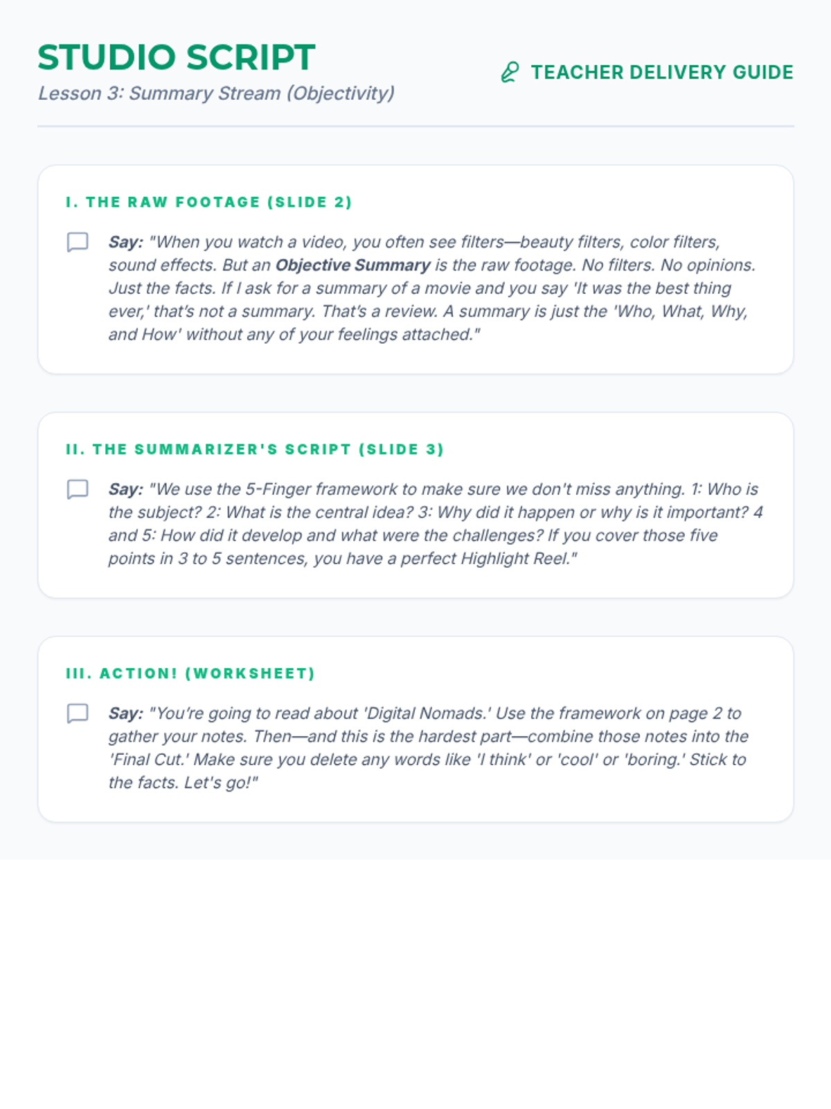 Teacher instructional script for Lesson 3, focusing on teaching objectivity through the 'raw footage' analogy and the 5-finger summary framework.