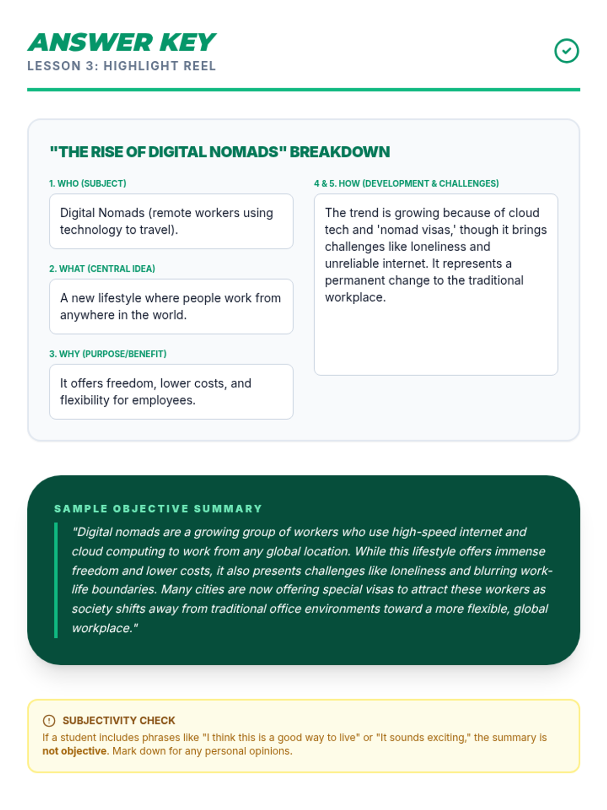 Answer key for the Lesson 3 'Highlight Reel Activity', providing notes for the 5-finger framework and a sample 3-5 sentence objective summary.