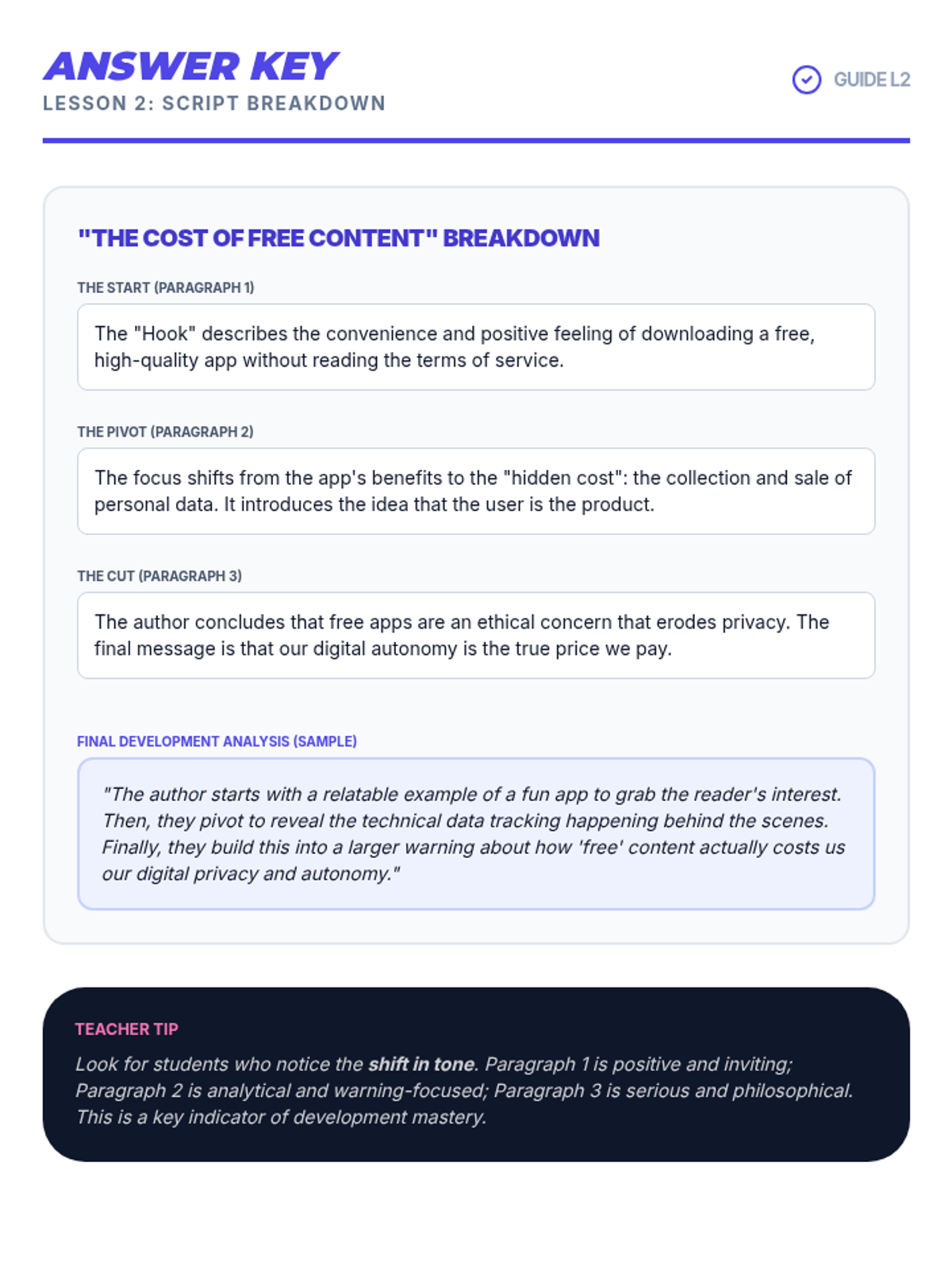 Answer key for the Lesson 2 'Development Map' worksheet, providing specific analysis of the 'Start', 'Pivot', and 'Cut' sections of the text.
