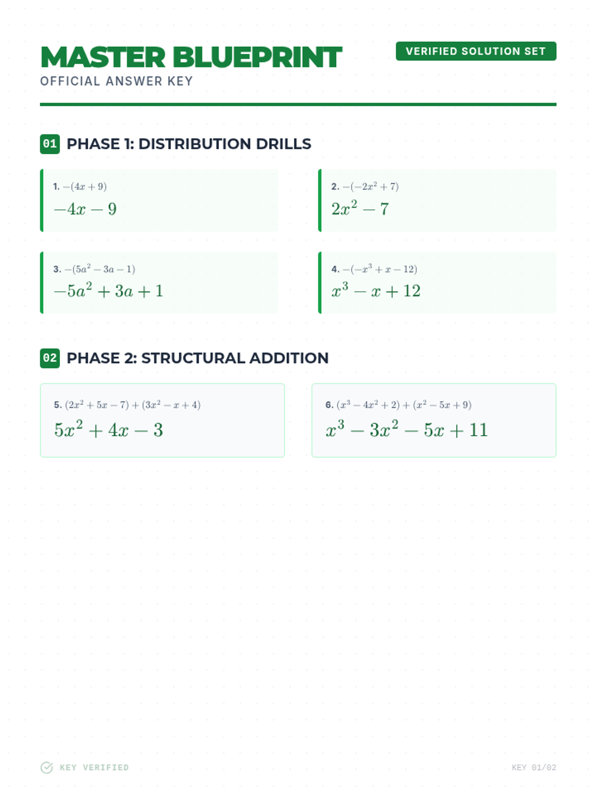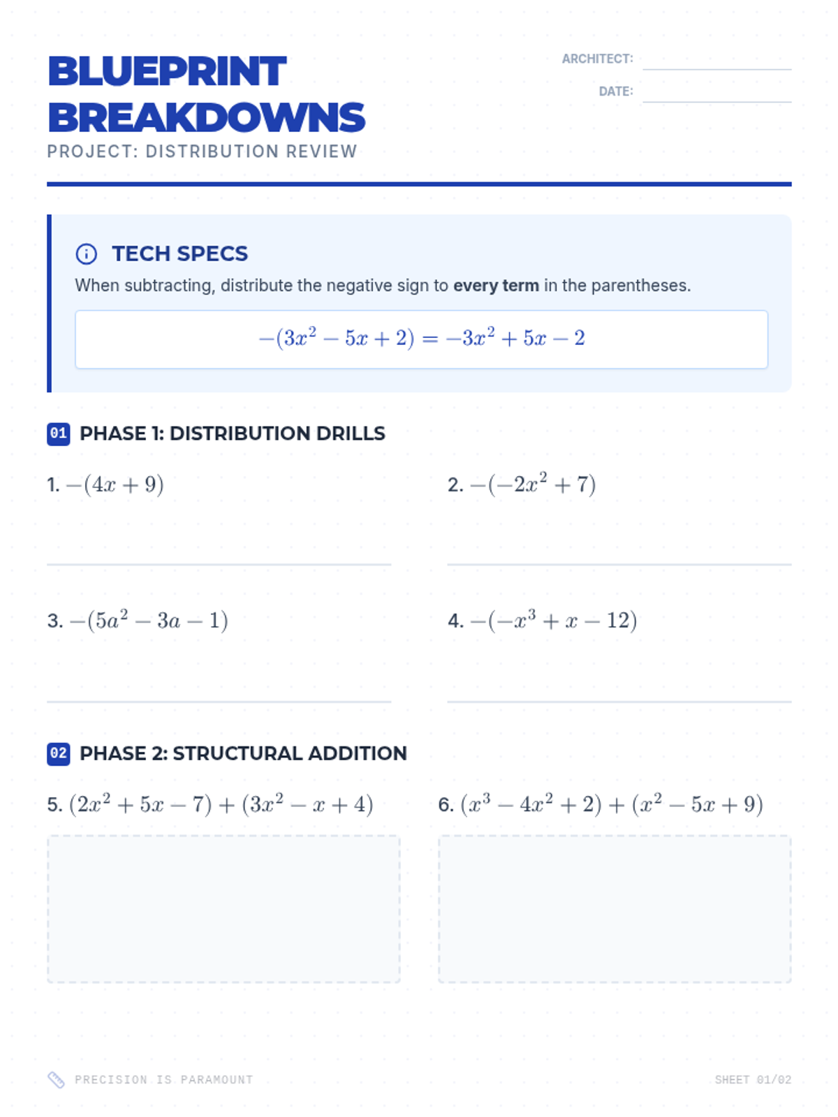 A 2-page student worksheet on adding and subtracting polynomials, focusing on the distributive property when subtracting. Includes a geometric application and an error analysis problem with a blueprint/engineering theme.
