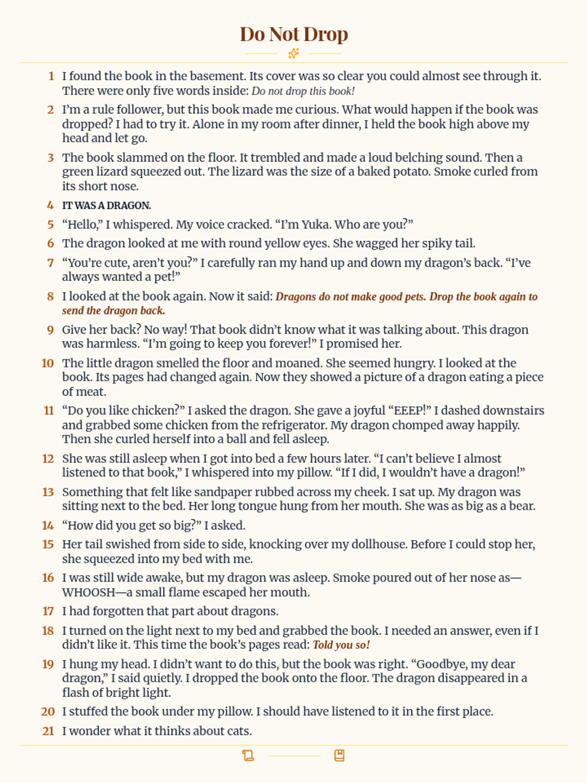 The full reading passage 'Do Not Drop', formatted as a storybook page for student use. Includes paragraph numbers for easy reference during comprehension activities. Condensed to fit on a single page.