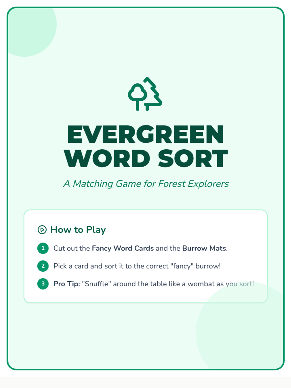 A comprehensive teacher resource containing vocabulary definitions, synonym/antonym banks, and discussion prompts for 'The Wombats Go Wild for Words'. It reflects the story's setting in the Evergreen Forest and the encounter with the duckling.