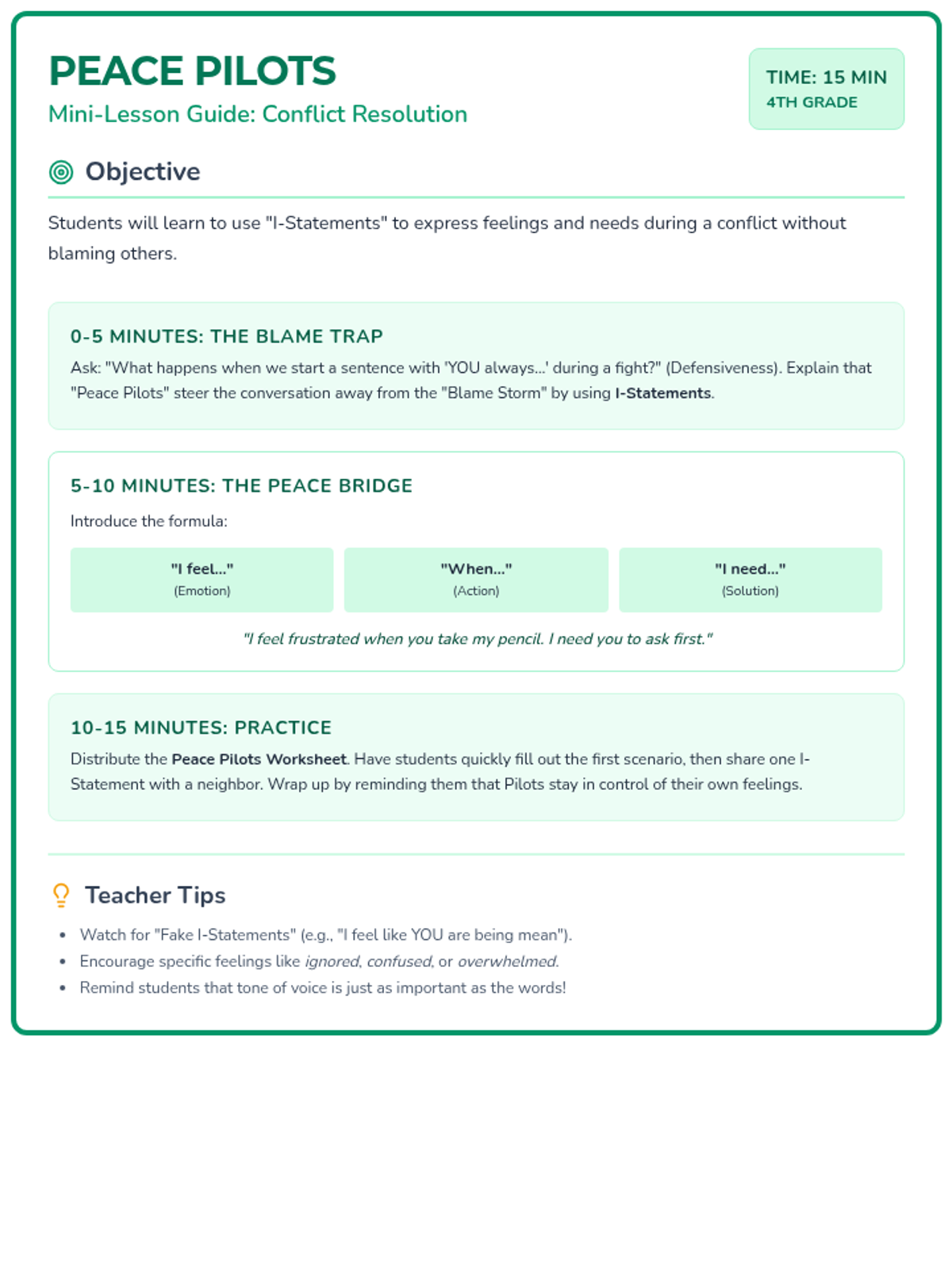 A revised 15-minute teacher guide for conflict resolution, optimized for single-page printing and visual consistency.