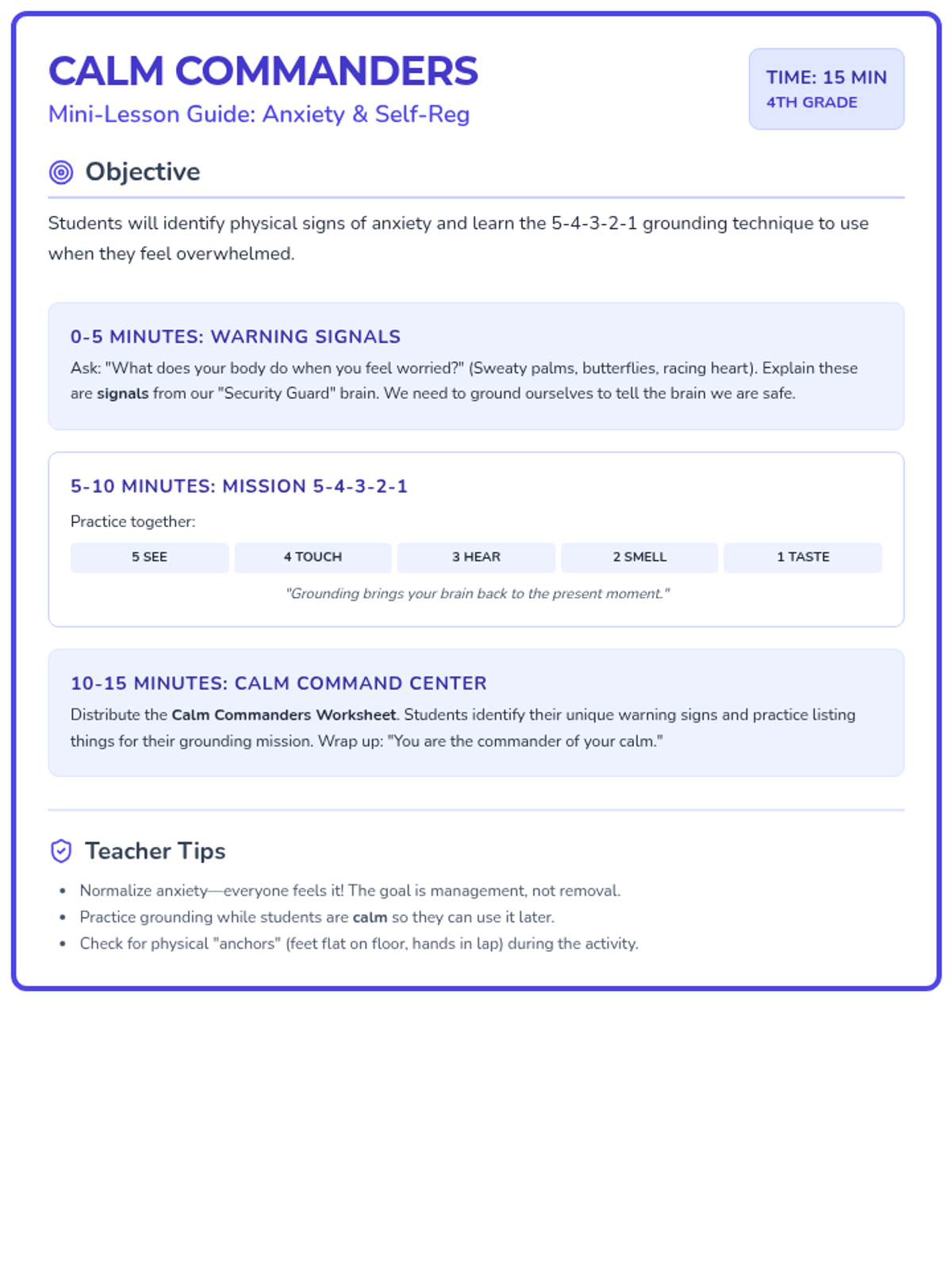A revised anxiety management teacher guide with consistent styling and single-page optimization.