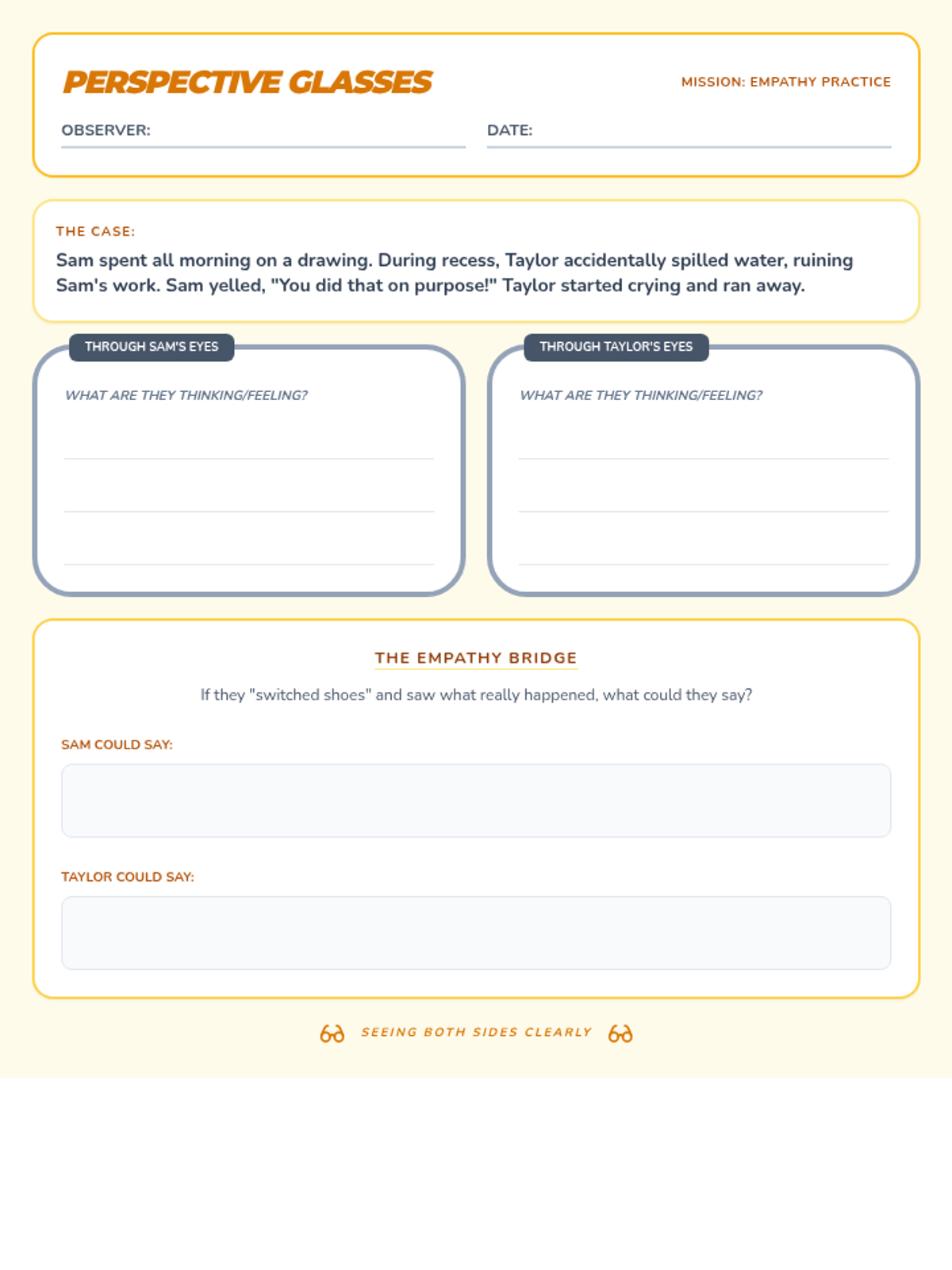 A revised Perspective Glasses worksheet with improved writing lines, better contrast, and a single-page layout.