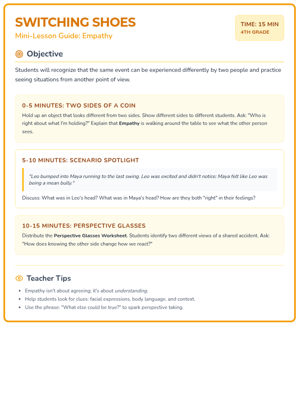 A revised empathy teacher guide with refined spacing and consistent visual elements for single-page printing.