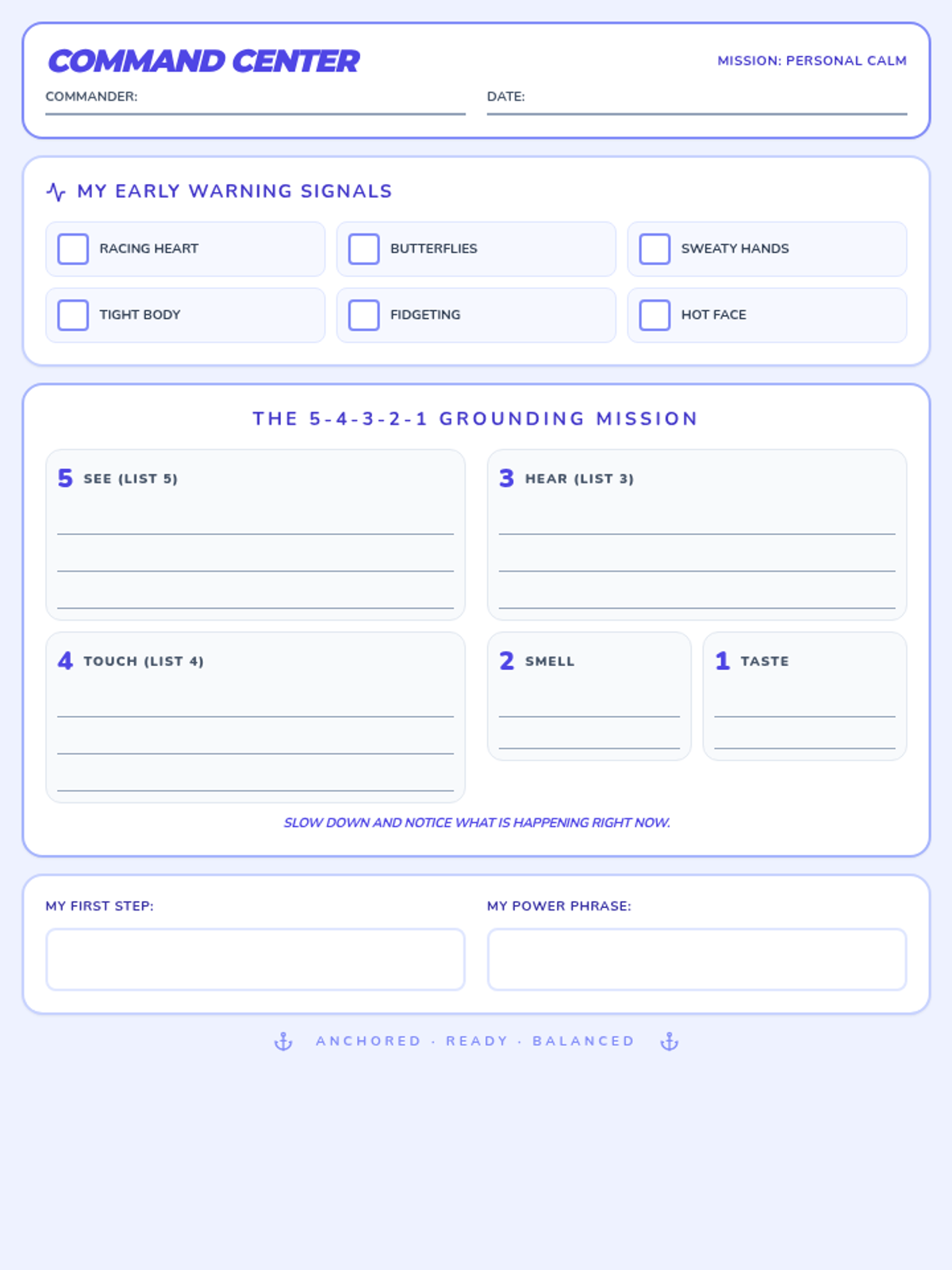 A final polished Calm Commanders worksheet with maximized writing space for sensory grounding and clear, readable headers.