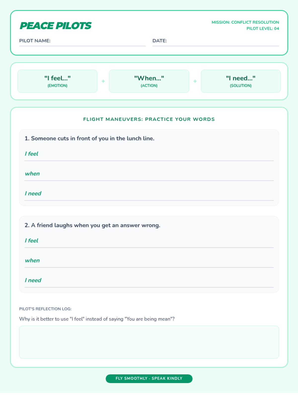A revised Peace Pilots worksheet with increased writing space and optimized single-page layout.
