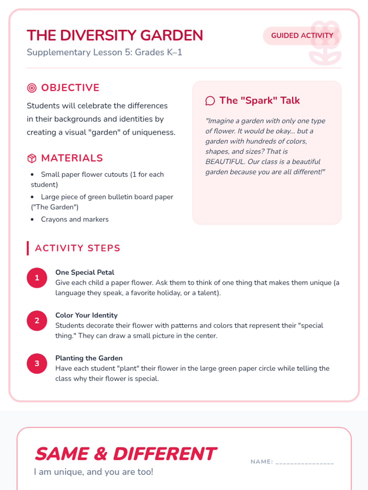 A community-building activity and reflection worksheet for grades K-1 focused on celebrating diversity and finding commonalities through the metaphor of a classroom 'garden'.