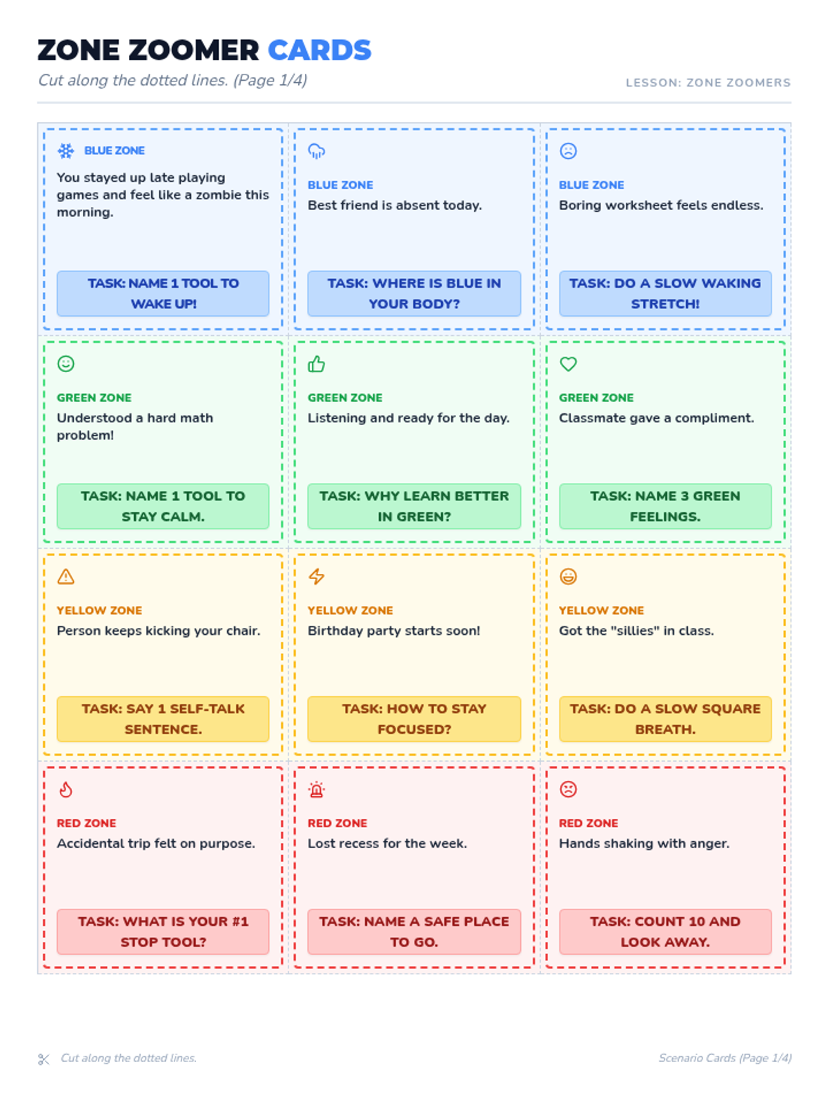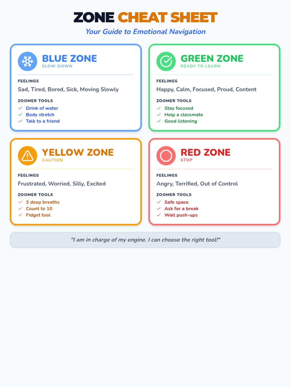 A visually clear reference sheet for students summarizing the four zones of regulation. Revised for one-page printing with high-contrast amber for yellow zone text and icons.