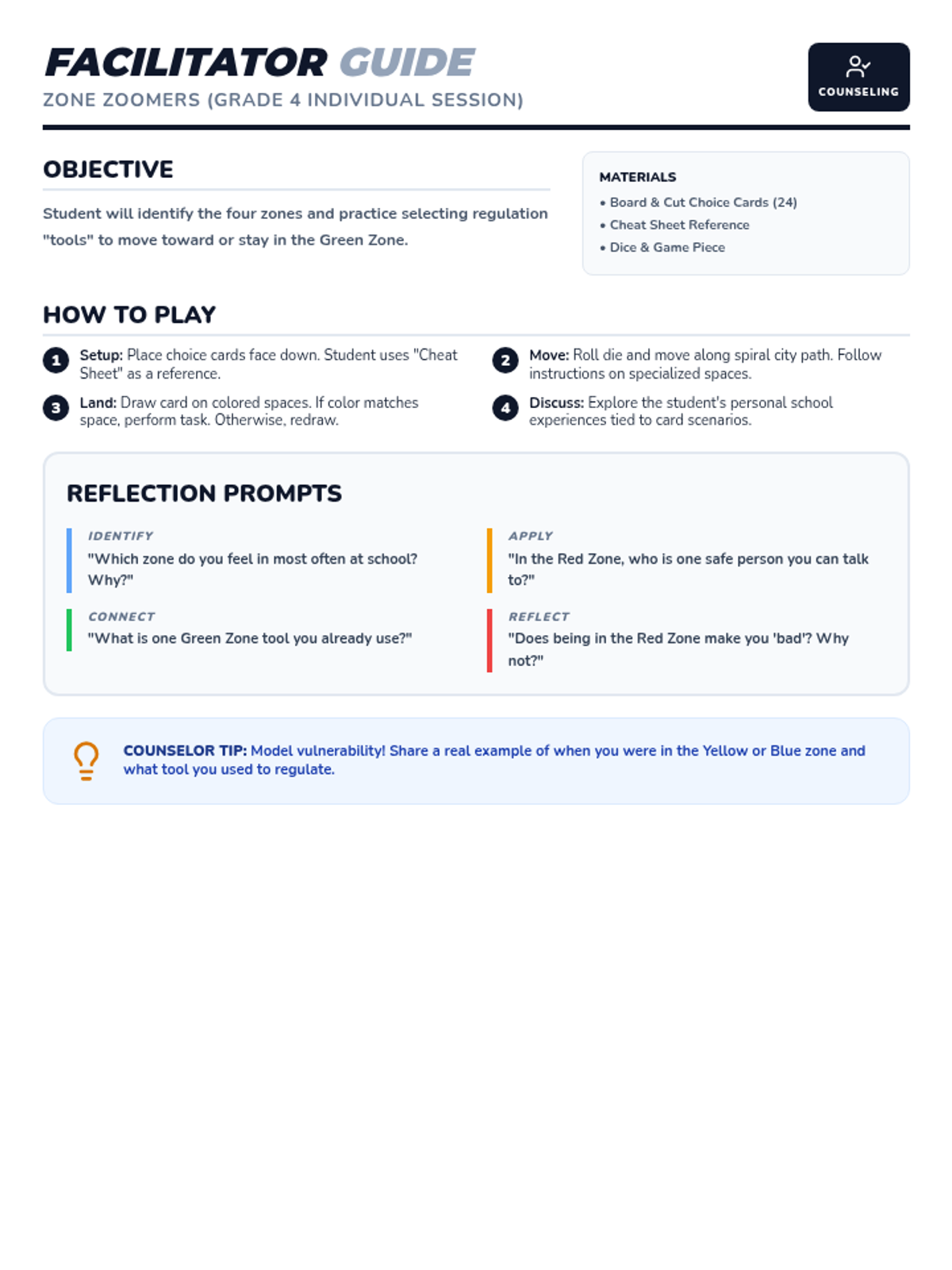 A comprehensive facilitator guide for the school counselor. Revised to fit on a single page with ink-efficient styling and updated for the expanded 24-card choice deck.