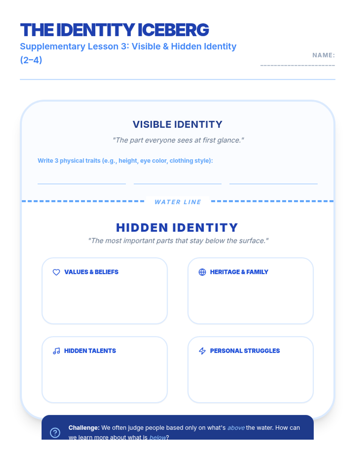 A sophisticated reflection worksheet for grades 2-4 using an iceberg metaphor to map out visible external traits versus deeper hidden identity factors.