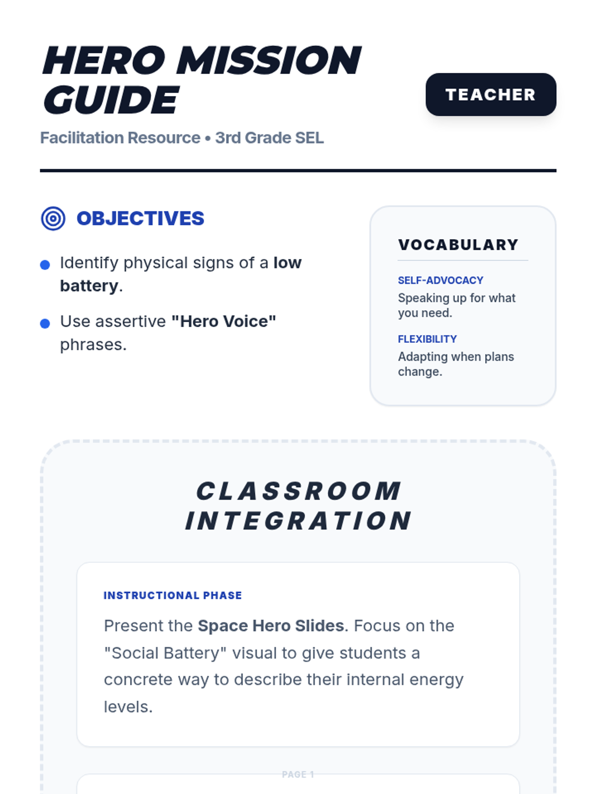 A professional teacher guide for the Space Hero Training lesson. This 2-page document ensures no overhanging content during print, with clearly defined sections and teacher tips for facilitation.