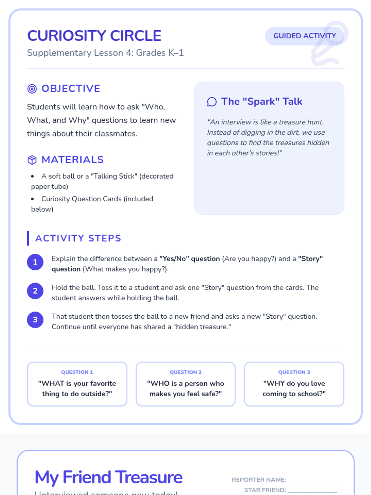 An interactive 'Curiosity Circle' activity and a portrait-drawing reflection sheet for K-1 students to practice basic interviewing and active listening skills.