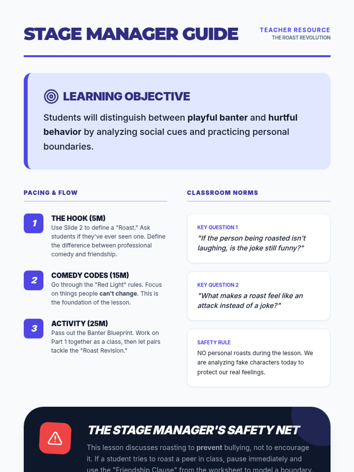 A comprehensive teacher facilitation guide for 'The Roast Revolution' lesson, providing pacing tips, discussion prompts, and safety guidelines for teaching students about healthy humor boundaries.