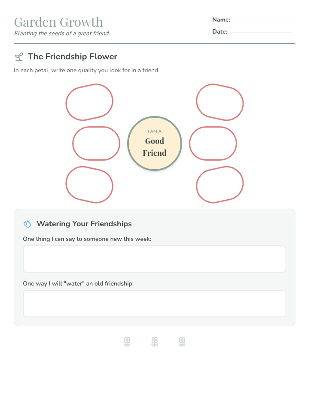 A 3rd-grade student worksheet featuring a floral layout where students write friendship qualities in petals and reflect on ways to maintain their social connections.