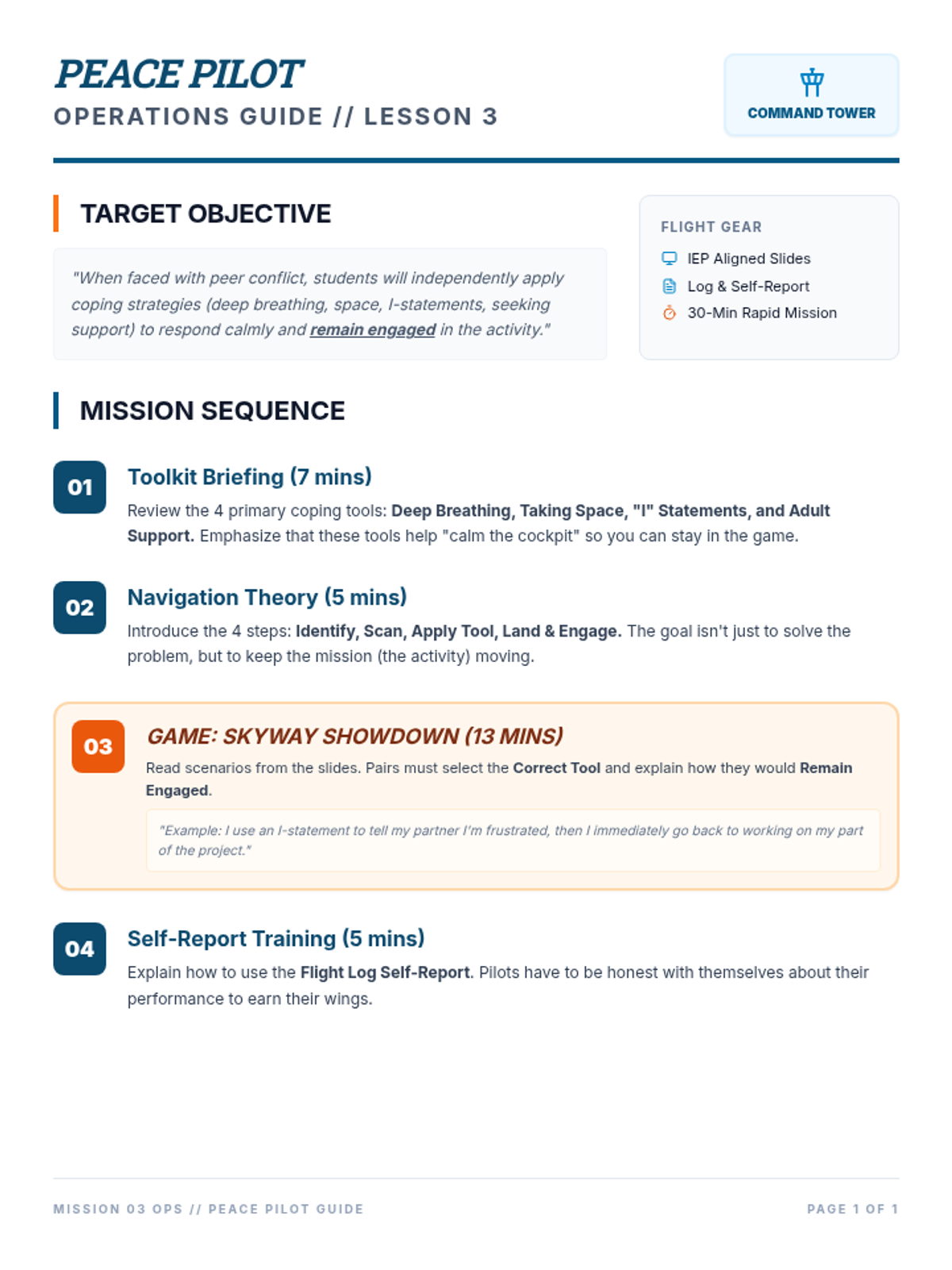Facilitator guide for counselors and teachers to lead the 'Peace Pilot' lesson, now condensed to 30 minutes and including the 'Skyway Showdown' interactive game.