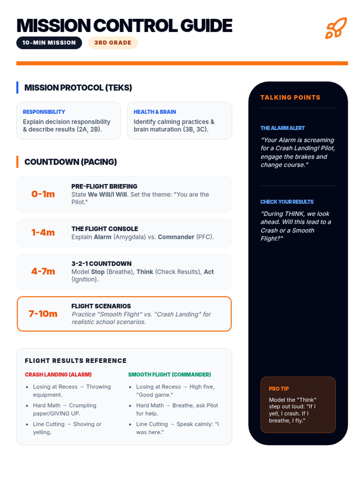 An updated space-themed teacher guide for the Mission Control lesson. Now includes a dedicated reference table for 'Crash Landing' vs 'Smooth Flight' examples and integrated pacing for scenario practice.